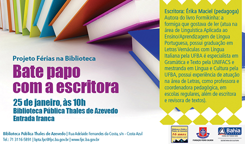 A escritora de livros infantis Érika Maciel participa neste sábado (25), às 10h, na Biblioteca Thales de Azevedo (Costa Azul) do projeto Bate papo com a escritora, idealizado pela unidade. Autora do livro Formikinha: a formiga que gostava de ler, ela irá conversar com crianças e jovens sobre a importância da leitura e do habito de escrever. Como também é especialista em gramática e texto, com certeza poderá dar algumas dicas para o público.