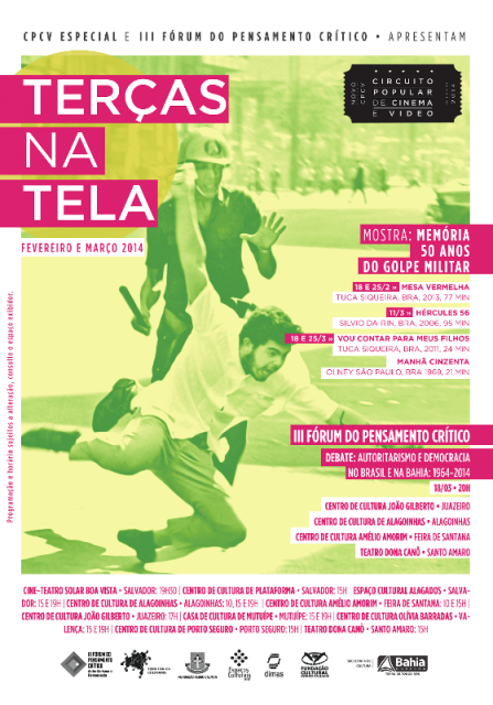 O projeto Terças na Tela do Circuito Popular de Cinema e Vídeo está de volta aos Espaços Culturais SEcultBA e traz uma mostra especial numa ação vinculada à primeira edição do Fórum do Pensamento Crítico, em 2014 – Autoritarismo e Democracia no Brasil e na Bahia (1964 – 2014). “A mostra 50 Anos do Golpe Militar começa no próximo dia 18 de fevereiro e segue até 25 de março, sempre às terças-feiras, com os filmes “Vou Contar para Meus Filhos”, “Manhã Cinzenta”, “Mesa Vermelha” e “Hércules 56”. Em “Vou Contar para Meus Filhos”, filme que abre a mostra no dia 18 de fevereiro, 21 ex-presas políticas da Colônia Penal Feminina do Bom Pastor, no Recife, se reencontram depois de 40 anos e relembram suas militâncias na época da ditadura. Com 30 minutos de duração, o documentário foi dirigido pela fotógrafa e jornalista Tuca Siqueira, numa co-produção da Garimpo Audiovisual e Comunicação e da Cabra Quente Filmes. O documentário é uma realização do Movimento Tortura Nunca Mais de Pernambuco, com o patrocínio do Projeto Marcas da Memória, da Comissão da Anistia do Ministério da Justiça. Vou Contar para os Meus Filhos é uma importante ferramenta de pesquisa sobre uma das fases mais marcantes da história do Brasil. O filme de 1968, “Manhã Cinzenta”, censurado em seu lançamento e exibido apenas em sessões secretas, tem direção do cineasta baiano Olney São Paulo e conta a história de um casal de estudantes que segue para uma passeata onde o rapaz, um militante, lidera um comício. Eles são presos durante a manifestação, torturados na prisão e sofrem um inquérito absurdo dirigido por um robô e um cérebro eletrônico. Os negativos e cópias do filme foram confiscados em 1969, mas uma das cópias foi salva e permaneceu escondida por 25 anos na Cinemateca do MAM, no Rio de Janeiro. “Mesa Vermelha” é mais um documentário com direção de Tuca Siqueira, narrado a partir de depoimentos, lembranças e denúncias de 23 ex-presos políticos da ditadura militar em Pernambuco. Eles estiveram detidos durante dez anos, de 1969 a 1979, entre a antiga Casa de Detenção, lugar que hoje abriga a Casa da Cultura, e a Penitenciária Professor Barreto Campelo. O filme retrata a convivência, as diferenças, os rachas, as greves de fome e o sentimento de solidariedade existente entre eles. Os ex-presos políticos eram encaminhados para duas unidades prisionais depois do período de torturas e interrogatórios para responder a processos e cumprir as penas. Estima-se que, nesses dez anos, cem presos políticos passaram pela antiga Casa de Detenção e 40 pela Penitenciária Barreto Campelo. Em 1969, durante a ditadura militar, o avião militar “Hércules 56” transportou para o exílio os presos políticos que foram trocados pelo embaixador norte-americano Charles Burke Elbrick, que havia sido seqüestrado por organizações de extrema-esquerda. Dirigido por Sílvio Da-Rin, o documentário leva o mesmo nome do avião e retrata esse episódio da história do Brasil. Os espaços culturais de Juazeiro, Alagoinhas, Feira de Santana e Santo Amaro, como parte da programação do III Fórum do Pensamento Crítico, promovem o debate Autoritarismo e Democracia no Brasil e na Bahia: 1964 – 2014. O bate-papo acontece às 20h, após a exibição dos filmes “Vou Contar para Meus Filhos’” e “Mesa Vermelha”. PROGRAMAÇÃO Vou Contar Para Meus Filhos (Tuca Siqueira, BRA, 2011, 24 min) – 18 de fevereiro e 18 de março Manhã Cinzenta (Olney São Paulo, BRA, 1969, 21 min) – 18 de fevereiro e 18 de março Mesa Vermelha (Tuca Siqueira, BRA, 2011, 77 min) – 25 de fevereiro e 25 de março Hécules 56 (Silvio Da-Rin, BRA, 2006, 95 min) - 11 de março III Fórum do Pensamento Crítico Debate: Autoritarismo e Democracia no Brasil e na Bahia: 1964 – 2014 18 de Março (terça-feira) às 20hs Centro de Cultura João Gilberto – Juazeiro Centro de Cultura de Alagoinhas – Alagoinhas Centro de Cultura Amélio Amorim – Feira de Santana Teatro Dona Canô – Santo Amaro