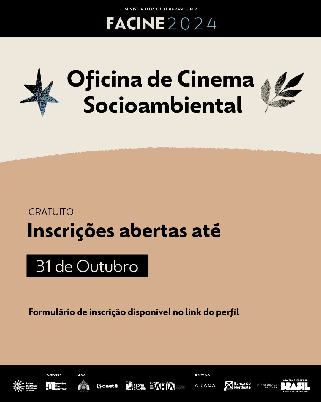 O Festival de Cinema Ambiental da Chapada Diamantina (Facine) tem o apoio da Fundação Pedro Calmon, unidade vinculada à Secretaria de Cultura da Bahia (SecultBA), para a realização do festival na Casa e Memorial Afrânio Peixoto, em Lençóis. O Facine vai oferecer 3 oficinas de cinema gratuitas. Uma delas, a Oficina de Cinema Socioambiental, facilitada pelo diretor de cinema André D´Elia, está com inscrições abertas até 31 de outubro, através do formulário. ACESSE!