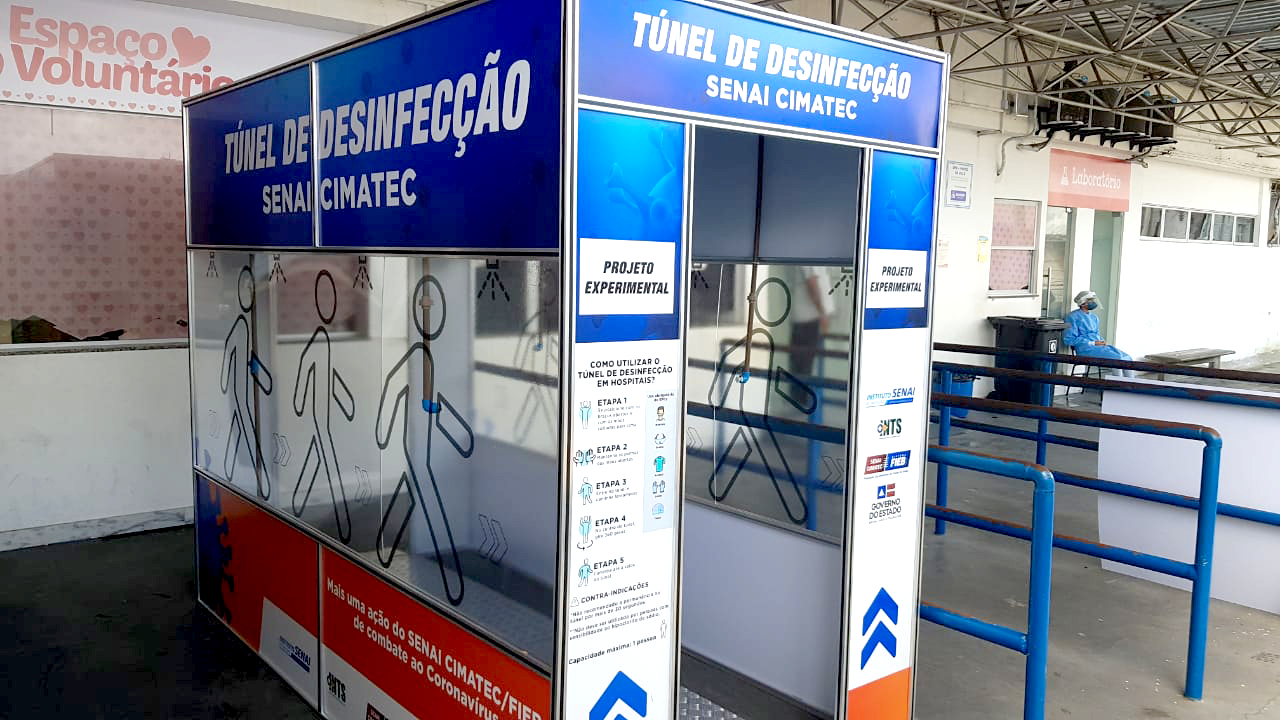 Seis destes túneis instalados foram adquiridos pelo Governo do Estado e as unidades implantadas nos hospitais Santo Antônio e Martagão Gesteira foram entregues pelo próprio Senai-Cimatec. Os túneis possuem formato de um corredor de 2,5 metros, pelo qual o profissional de saúde passa ao final do seu expediente, antes da retirada do Equipamento de Proteção Individual (EPI), para desinfecção. Cada equipamento possui estrutura de alumínio, com tubulação de PVC, uma bomba de alta pressão e bicos aspersores que fazem o processo de nebulização de uma solução de hipoclorito.