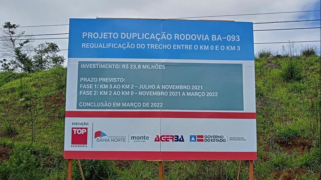 A Concessionária Bahia Norte está iniciando a mobilização de equipes para realizar a duplicação e requalificação do quilômetro 0 ao 3 da rodovia BA-093. O investimento previsto é da ordem de R$24 milhões e prevê a duplicação das faixas, sistema de drenagem, implantação de nove passagens elevadas de pedestres e demais dispositivos que proporcionarão segurança viária e mobilidade no tráfego de veículos, além de reordenar a faixa de domínio, minimizando impactos socioambientais como a desocupação de áreas lindeiras e supressão vegetal.