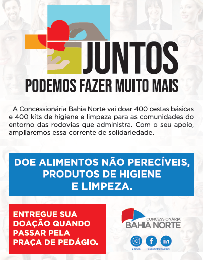 A partir do próximo dia 20 de abril, a Bahia Norte inicia uma campanha de arrecadação de alimentos não perecíveis e itens de higiene e limpeza, que serão doados para comunidades localizadas no entorno das rodovias administradas pela concessionária.