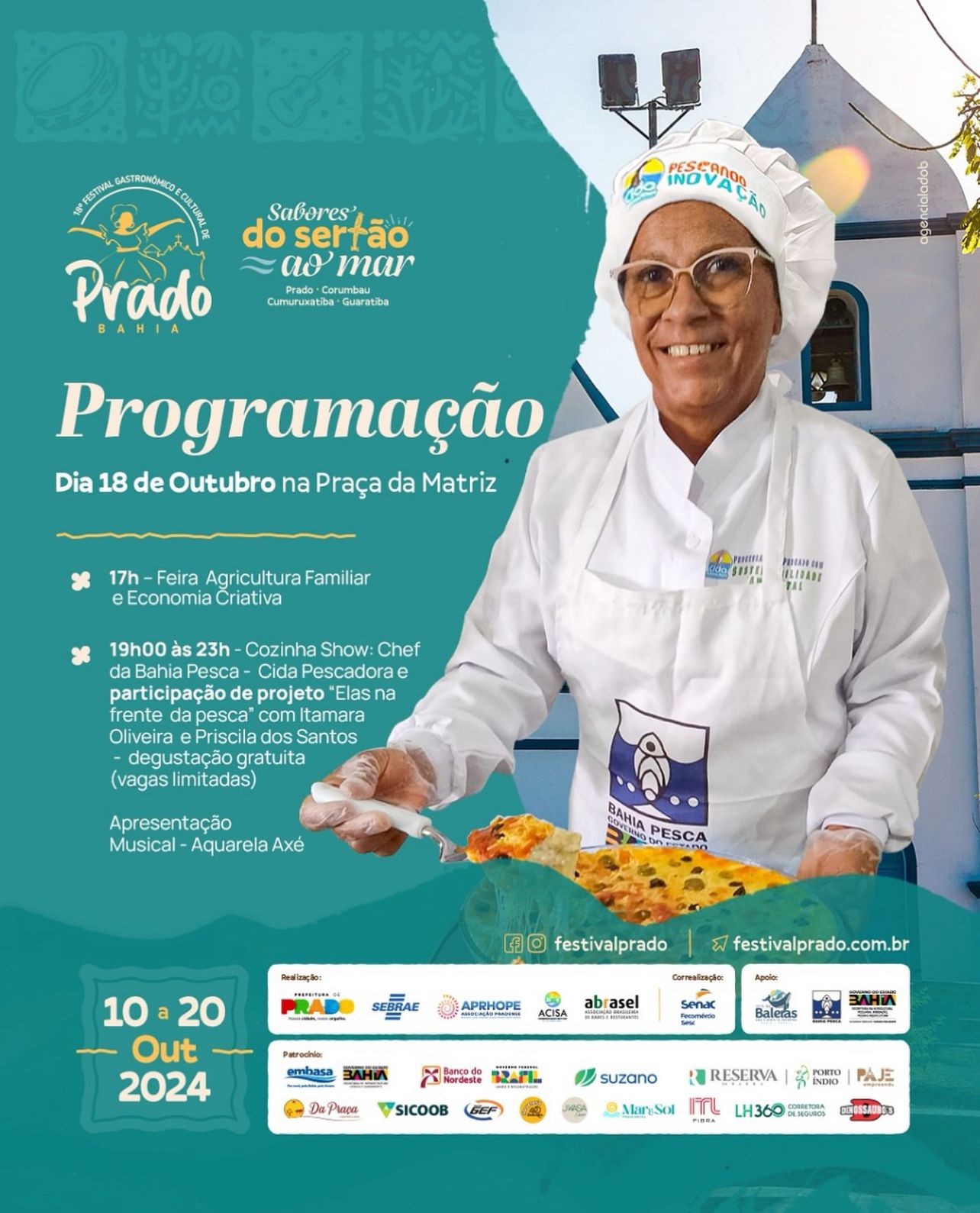 A Bahia Pesca, em parceria com a Associação Brasileira de Bares e Restaurantes (Abrasel-BA), participa ativamente do 18º Festival Gastronômico e Cultural de Prado, realizado pela Prefeitura Municipal de Prado, destacando seu compromisso com o desenvolvimento sustentável e a valorização da pesca e aquicultura no estado. O evento, que acontece na Praça da Matriz, é uma celebração das riquezas culturais e gastronômicas da região.
