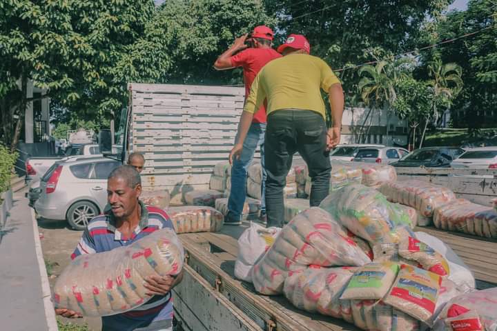 Arroz orgânico e farinha são os itens que compõem a entrega, fruto de doação do Movimento dos Trabalhadores Rurais Sem Terra (MST) da Bahia, referência na produção de alimentos saudáveis em todo o país.