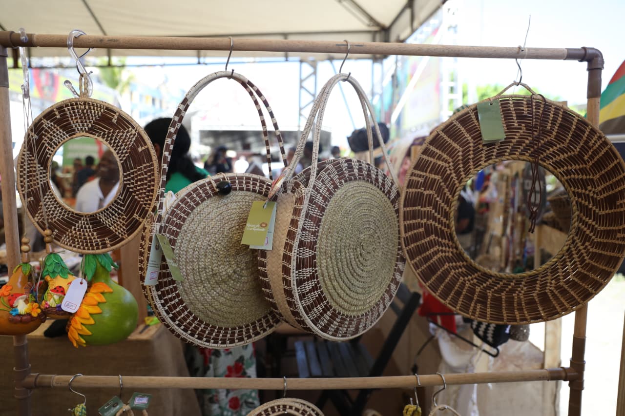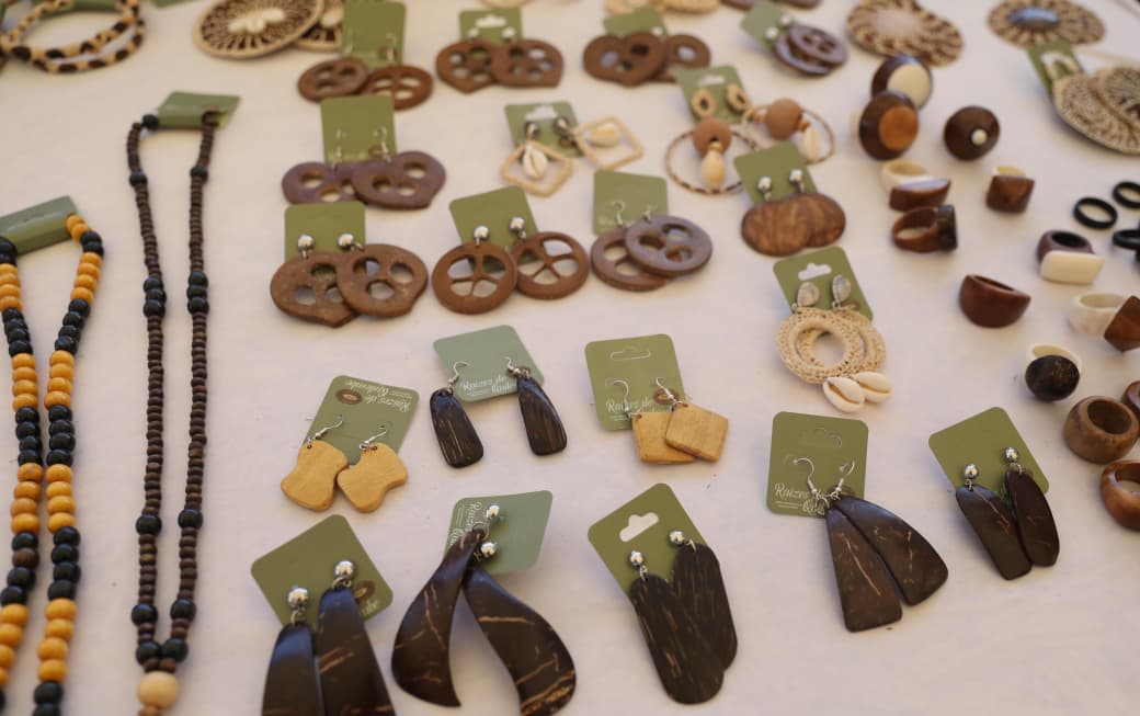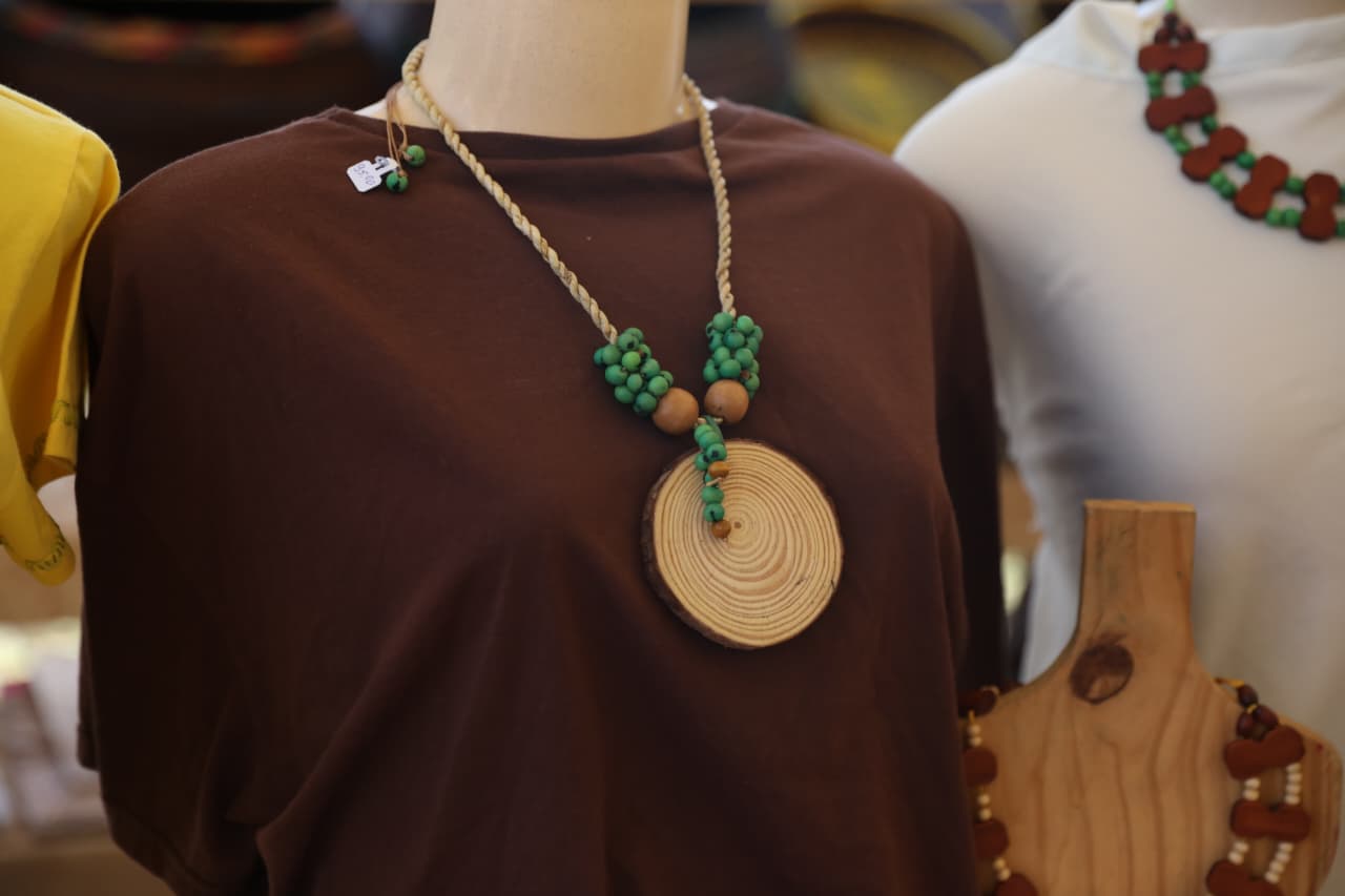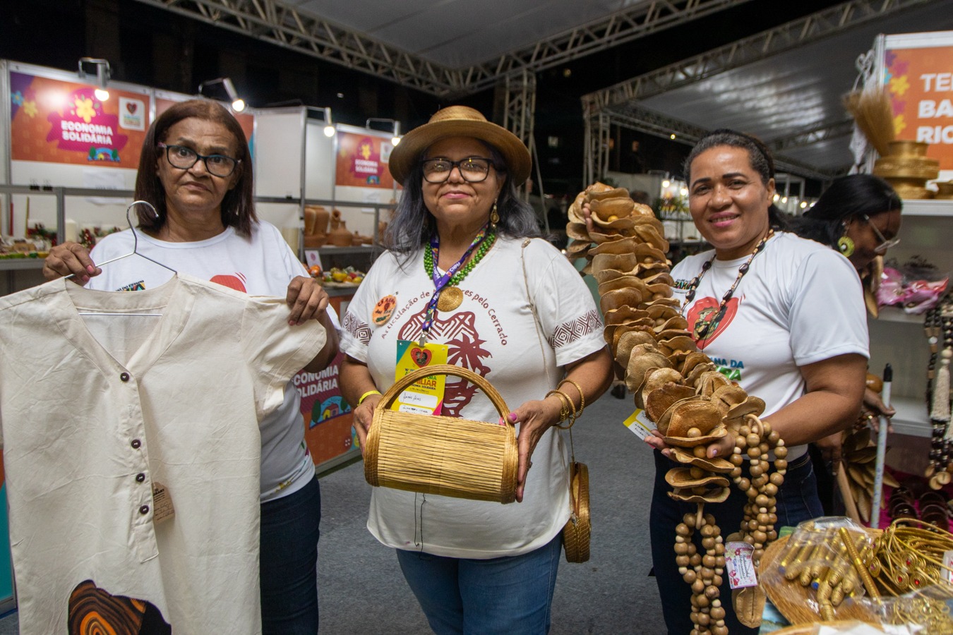 A expositora e Aurenilde Aires, conhecida como Áurea, do grupo de Mulheres Associação Pró-cultura, de Formosa do Rio Preto, do Cerrado baiano, que trabalha com produtos feitos com capim dourado e buriti, conta o que o público vai encontrar no estande do território Bacia do Rio Grande. "Nós trouxemos de comunidades tradicionais o trabalho das mulheres geraizeiras. Trouxemos biojoias, bolsas, suplat, jarros, canetas ecologicamente corretas, tiaras e anéis, tudo usando o capim dourado e também algumas peças usando fibras de buriti, também do Cerrado. Temos também, do mesmo território, o material de mesa posta, que usa outras cascas e sementes nativas do Cerrado. lsso pra nós é importante, é o protagonismo feminino, é resistência, porque o que a gente mais quer é que tenhamos o Cerrado em pé, porque tem cara de mulher".