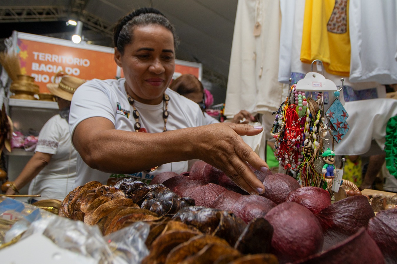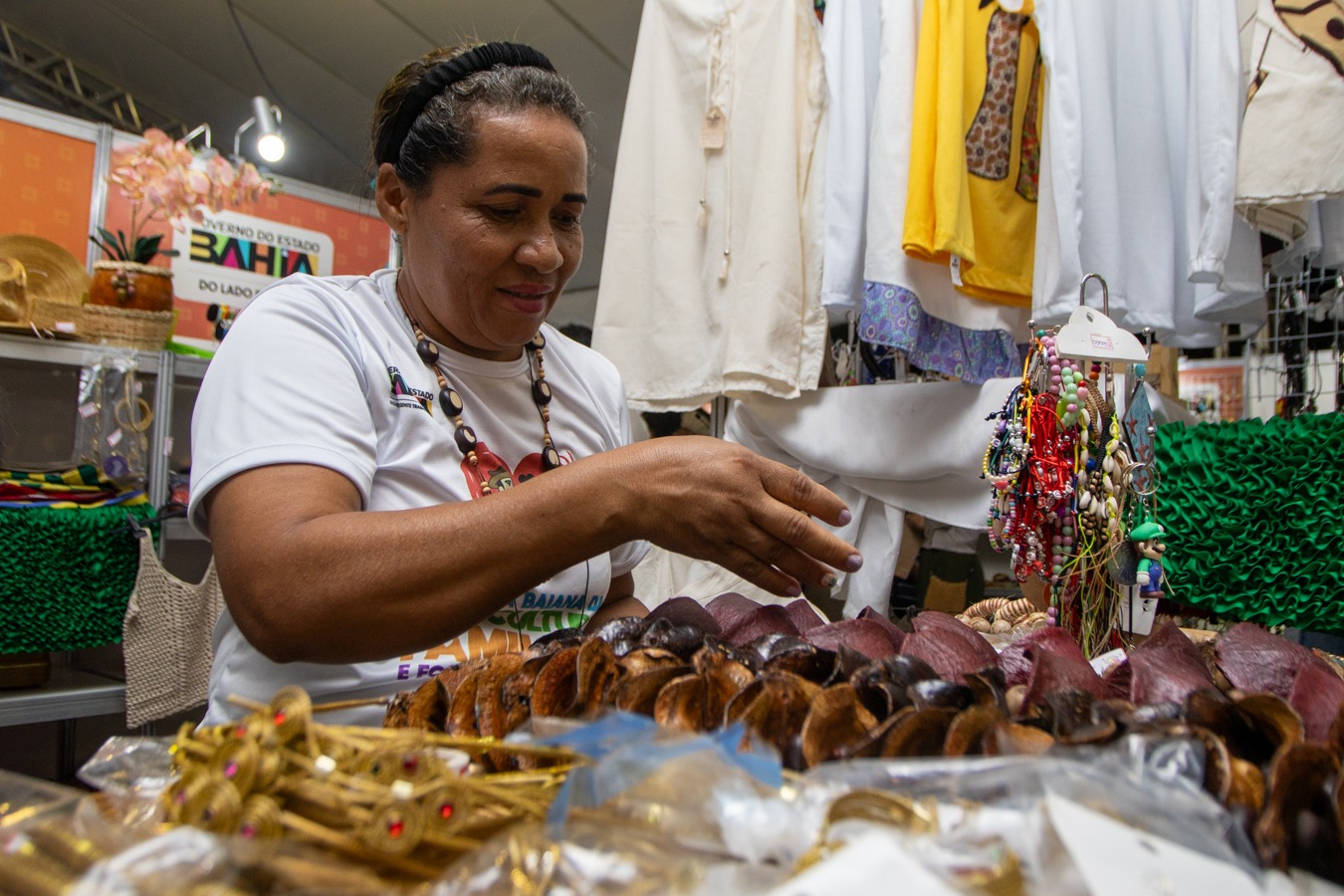 Ana Amélia Câmara, que é gestora de escola da rede estadual, ficou feliz em reencontrar as peças produzidas por mulheres do seu município de origem, Formosa do Rio Preto. agricultura familiar. "Já conheci outros tipos de feira que oferecia essa proposta de artesanato, mas essa valoriza a cultura do nosso m reúne os municípios, as potencialidades do nosso estado e traz pra gente visitantes, soteropolitanos, pessoas que visitam a nossa cidade, a possibilidade de encontrar diversos tipos de produtos que possam alegrar a nossa casa, como o artesanato que adquiri, que veio da minha região, do Oeste da Bahia, mas de poder também presentear amigos, familiares, ainda mais nesse período natalino, festivo de confraternizações, que a gente pode ter um objeto diferenciado, que tem a cara do nosso estado".