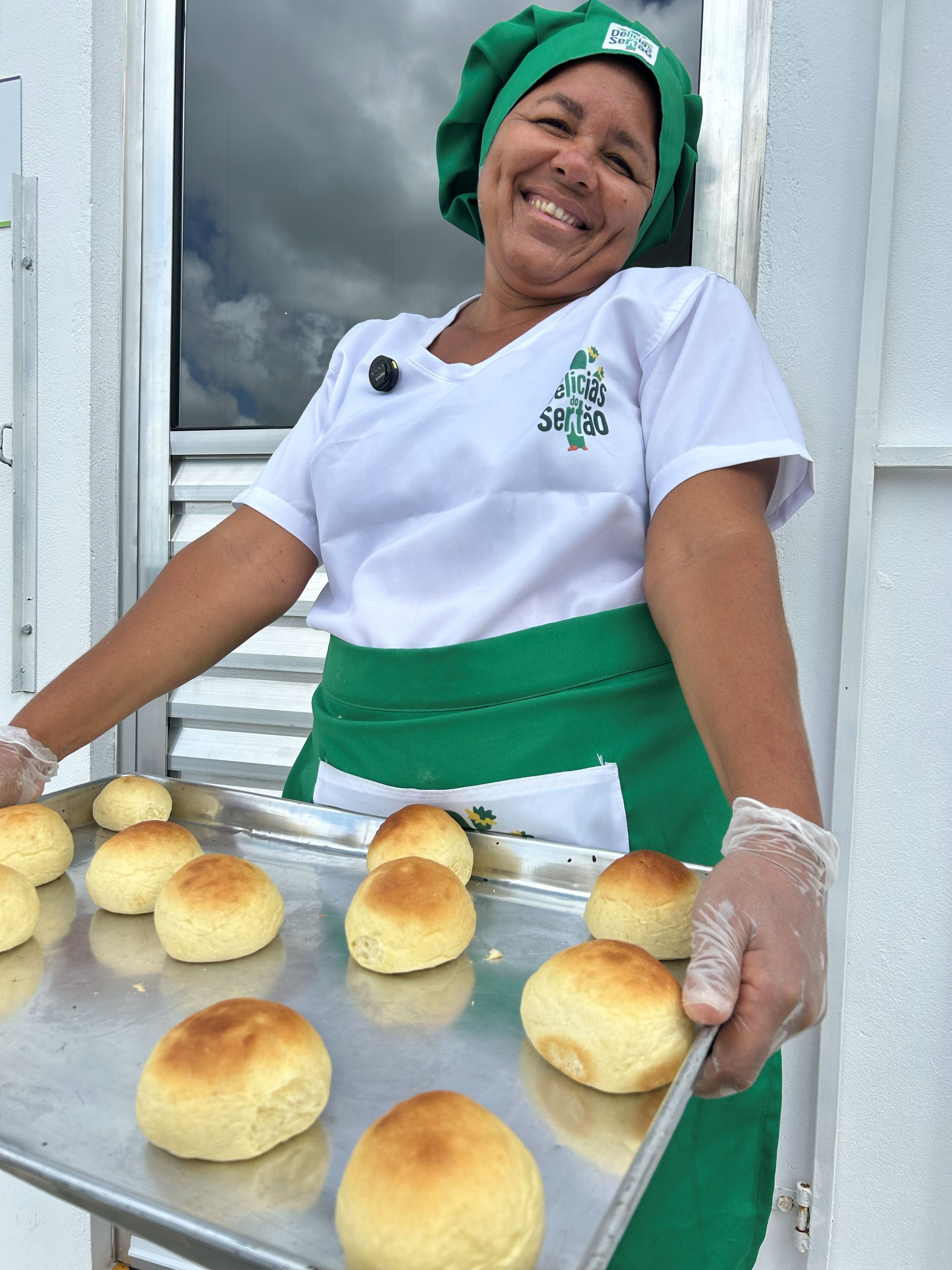 Doralice Alves mora na comunidade quilombola de Várzea Queimada, no município de Caém, e integra o Grupo Produtivo de Mulheres Delícias da Tia Likinha. Mãe solo, ela sustenta a casa e as duas filhas com a venda de avoadores, beijus, pães e sequilhos produzidos na cozinha comunitária.