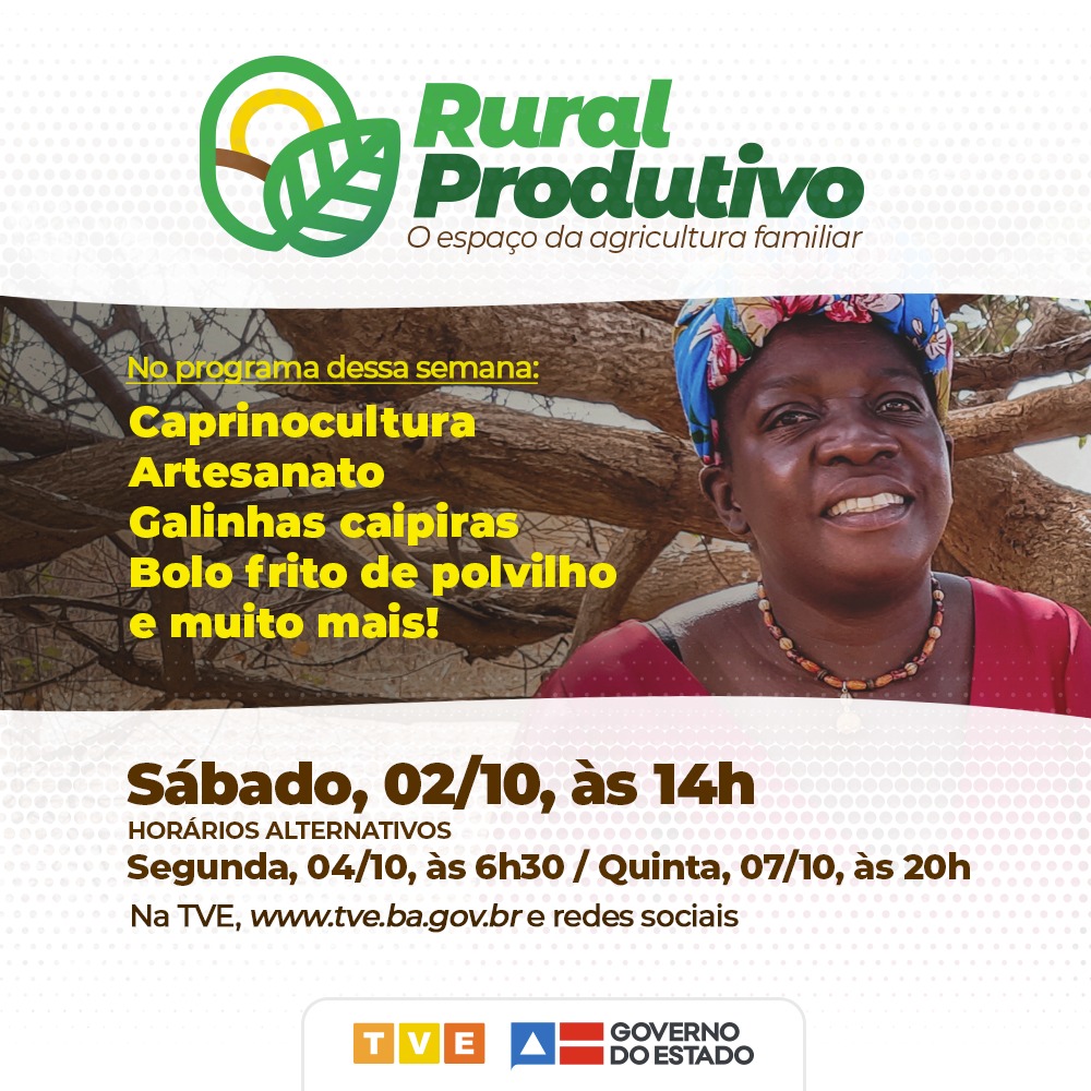 O Rural Produtivo deste sábado (02) vai mostrar a criação de caprinos da Associação de Moradores Criadores e Produtores Indígenas Pankararê, no município de Glória e o artesanato, a produção de hortaliças e de mandioca das mulheres, em Candiba. Também vai falar sobre o crescimento da criação de galinhas, no município de Wanderley. E ainda tem uma receita de bolo frito de polvilho e música com a banda Lascachinela. Sempre aos sábados às 14h, o programa tem horário alternativo às segundas-feiras, às 6h30, e quintas-feiras, às 20h, na TVE.