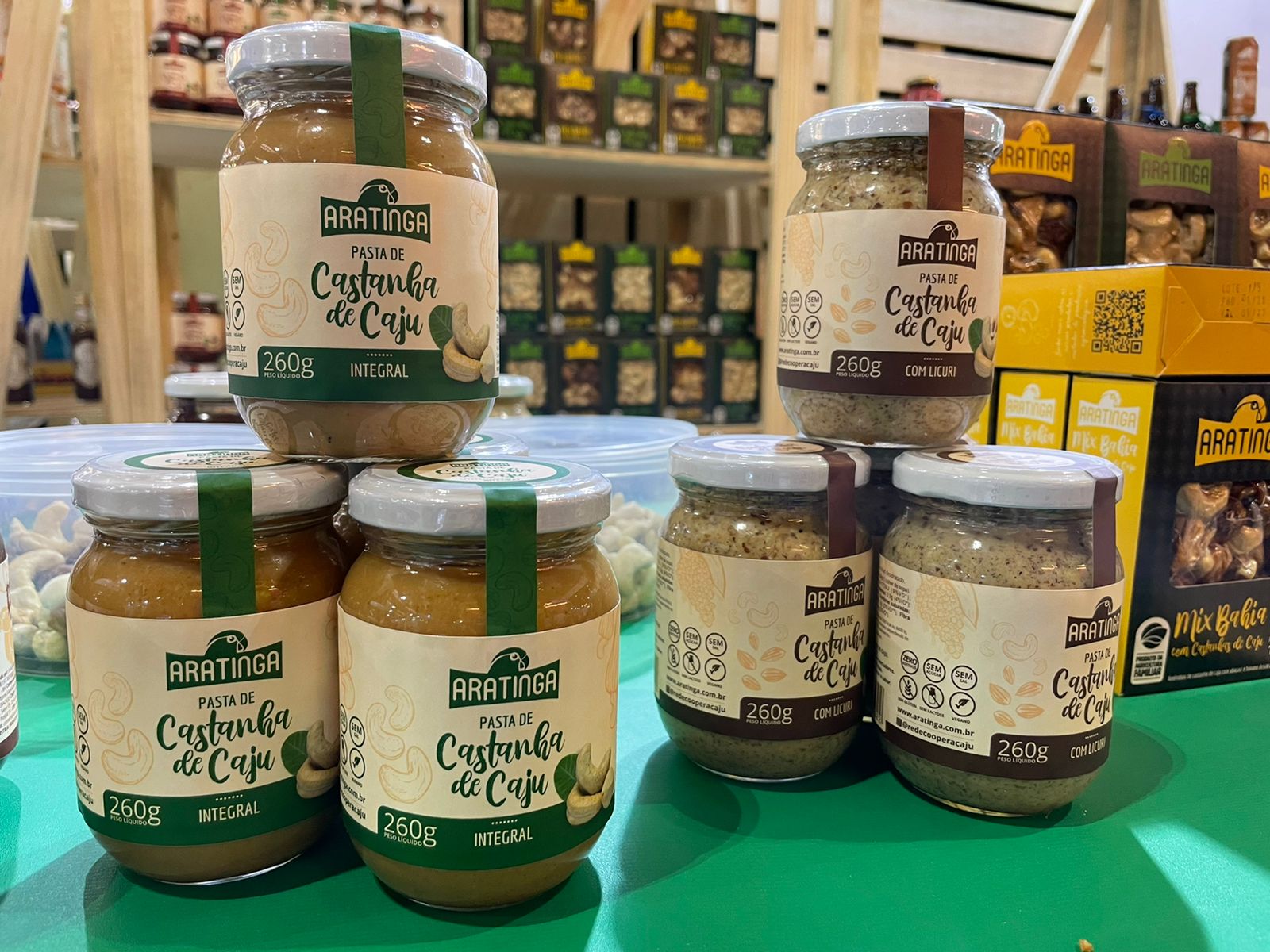Por lá, os visitantes encontram essa castanha típica da região Nordeste, em um mix de produtos da Cooperativa dos Cajucultores Familiares do Nordeste da Bahia (Cooperacaju), localizada no município de Ribeira do Pombal. Castanhas de caju, nas versões natural e salgada, pasta integral, pasta com cacau, pasta com licuri, e mix de castanha, banana e abacaxi desidratado são os produtos apresentados pela cooperativa.