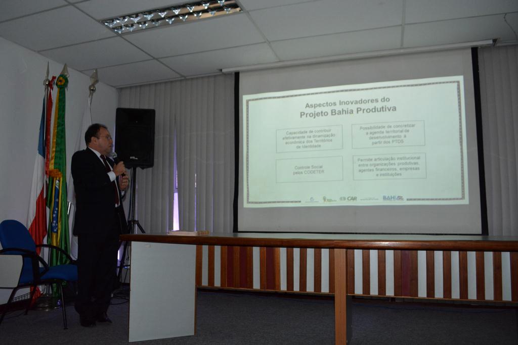 Wilson Dias apresentou os aspectos inovadores do projeto Bahia Produtiva e o conceito das alianças produtivas territoriais. Ele afirmou que as alianças são possíveis a partir da união dos diversos atores, como universidades, cooperativas e instituições de assistência técnica, em torno em de um objetivo comum: “O edital de aliança produtiva territoriais, é uma possibilidade concreta de unir, em um mesmo território, cooperativas e associações que trabalham com o mel, leite, ou outros produtos, ou seja, estamos dando passos concretos para a Bahia até 2035, desenvolvendo ações que possam convergir para essa lógica”.
