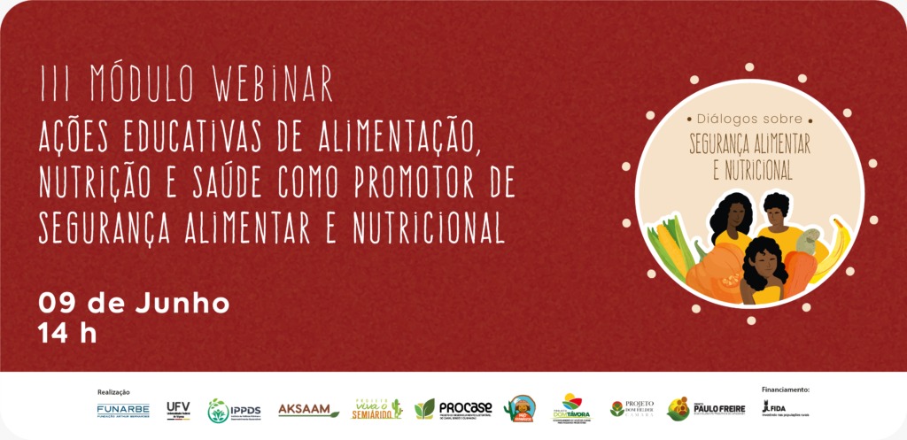 Acontece, no próximo dia 09 de junho, a partir das 14h, o terceiro módulo do webinário “Diálogos sobre Segurança Alimentar e Nutricional”. Com o tema “Ações educativas de alimentação, nutrição e saúde como promotor de Segurança Alimentar e Nutricional”, o evento reunirá técnicos, técnicas, agricultores e agricultoras de projetos apoiados pelo Fundo Internacional de Desenvolvimento Agrícola (FIDA) no Brasil, além de pessoas do meio acadêmico. As inscrições podem ser feitas por meio do linkhttps://bit.ly/2RXSBqc,e a exibição será feita, ao vivo, pelo canal do Youtube no projeto Aksaam.