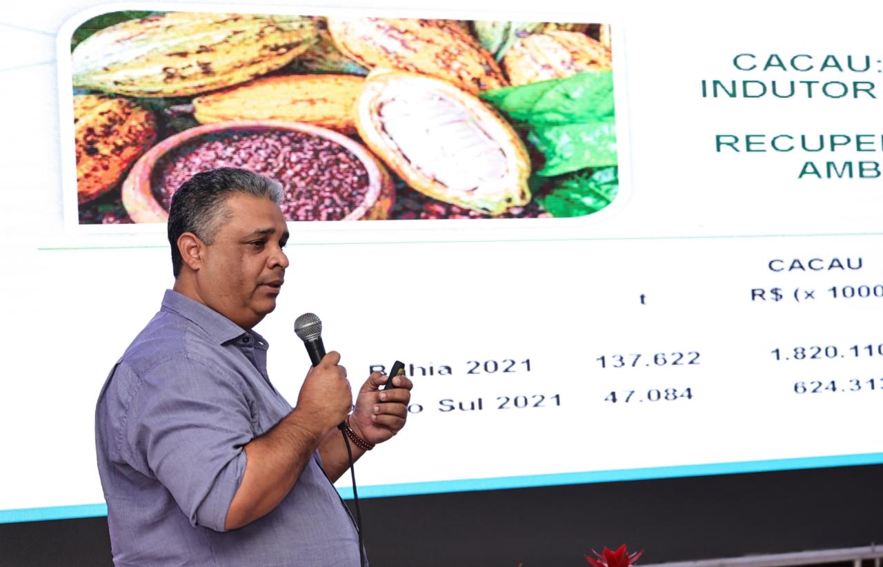 Uma das experiências exitosas apresentadas no evento foi a estratégia Cacau +, do Consórcio Ciapra Baixo Sul. O momento foi ministrado pelo secretário-executivo do consórcio, Leandro Ramos. "Finalizamos o primeiro ciclo do Cacau + e a gente já consegue identificar os resultados na assistência técnica e um aumento de produtividade de 103%, já que saímos de 14,2 para 29 arrobas por hectare, cumprindo aí o planejamento inicial para o programa, que prevê no horizonte de três anos a elevação da produtividade para 80 arrobas por hectare."