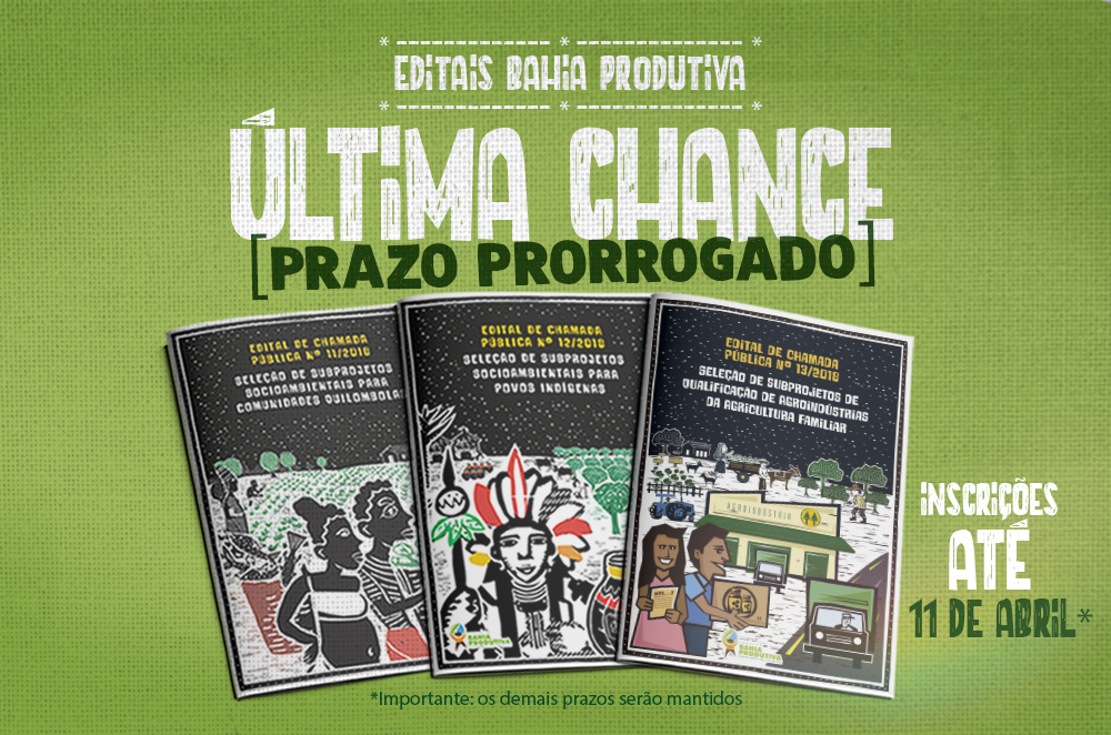 Estão prorrogadas, até o próximo dia 11 de abril, as inscrições para os editais do projeto Bahia Produtiva de Qualificação de Agroindústrias e voltados para a inclusão produtiva de Comunidades Quilombolas e Povos Indígenas. Com a prorrogação as associações e cooperativas As outras etapas do processo de seleção permanecem como está previsto nos editais disponíveis no site (www.car.ba.gov.br) da Companhia de Desenvolvimento e Ação Regional (CAR), empresa pública vinculada à Secretaria de Desenvolvimento Rural (SDR).