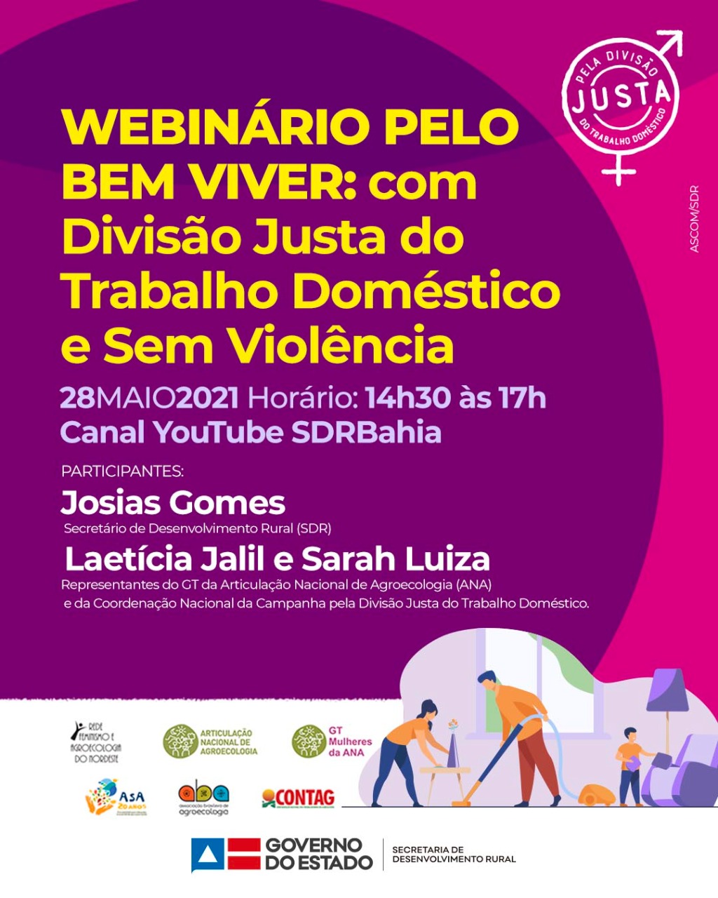 “Pelo bem-viver: com divisão justa do trabalho doméstico e sem violência!”, é o tema do seminário on-line que acontece, nesta sexta-feira, a partir das 14h30, com transmissão pelo canal @SDRBahia, no YouTube. O evento, promovido pela Secretaria Estadual de Desenvolvimento Rural (SDR), encerra o mês de atividades em prol do debate e reflexão sobre a justa divisão sexual do trabalho e a violência doméstica e seus números alarmantes durante a pandemia.