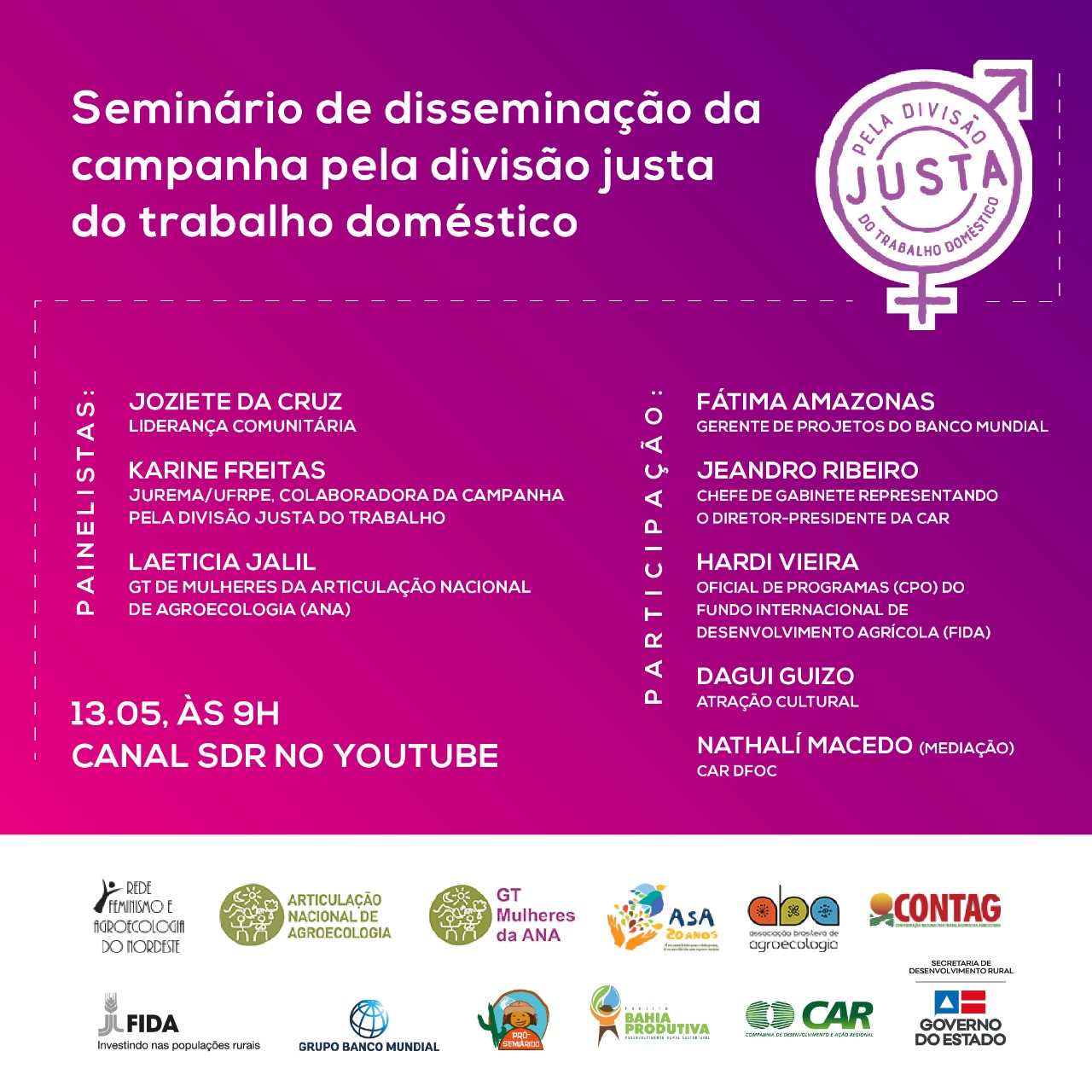 A Companhia de Desenvolvimento e Ação Regional (CAR), empresa pública vinculada à Secretaria de Desenvolvimento Rural (SDR), realiza, no próximo dia 13 de maio, às 9h, o seminário de disseminação da Campanha pela Divisão Justa do Trabalho Doméstico. A atividade faz parte de um conjunto de ações que a CAR/SDR está promovendo, neste mês de maio, para mobilizar e gerar momentos de reflexão sobre a sobrecarga do trabalho das mulheres, violência e divisão sexual do trabalho.