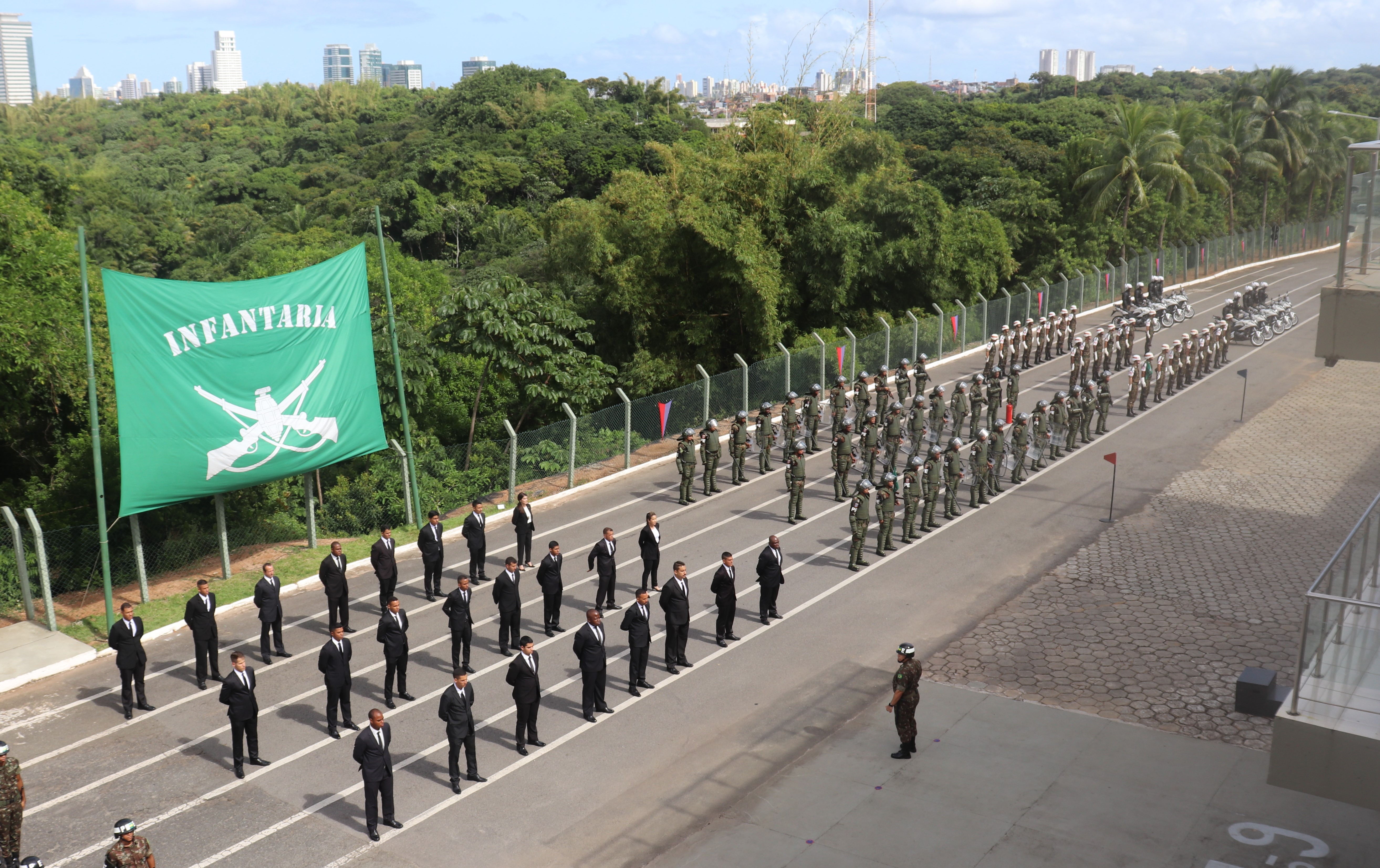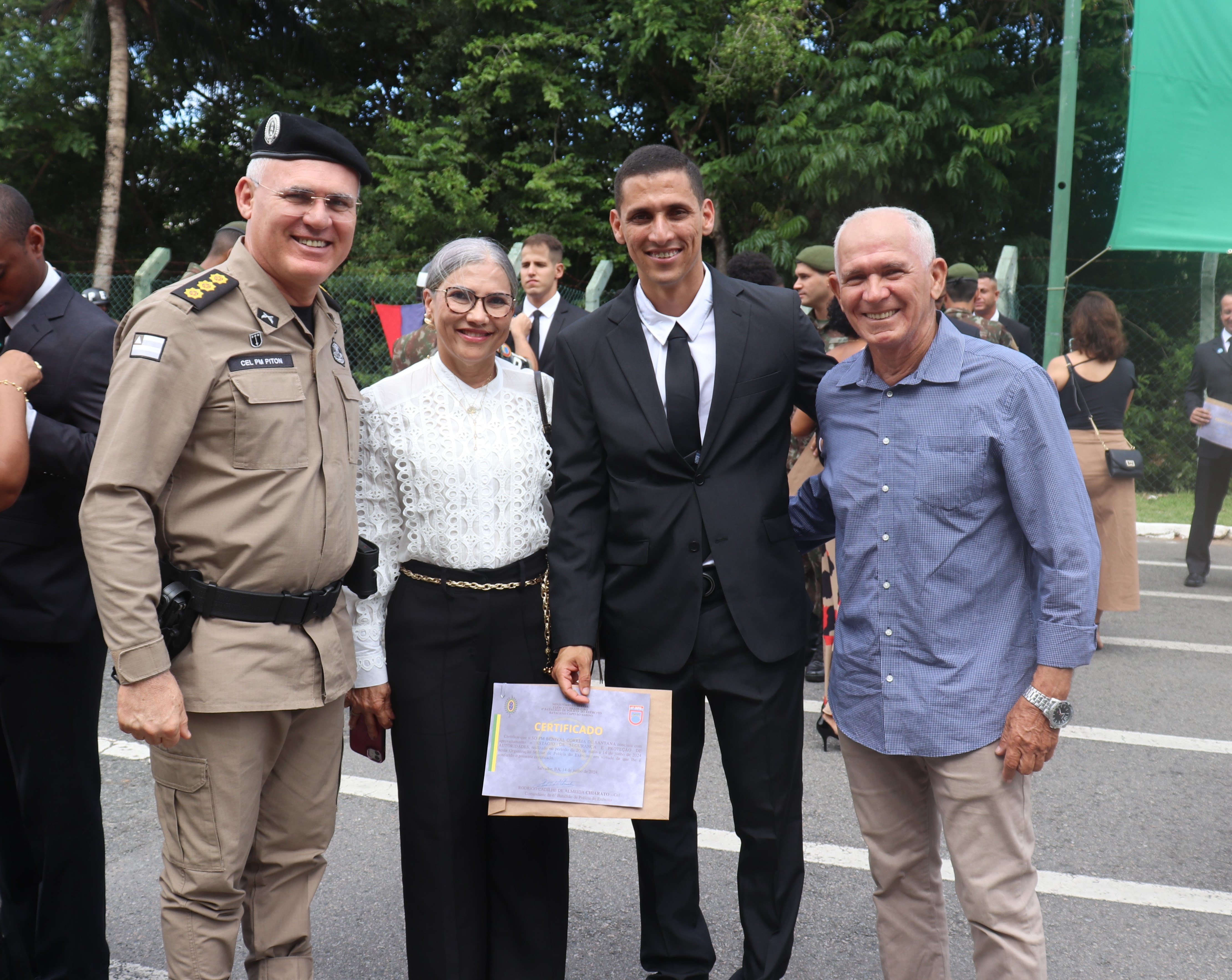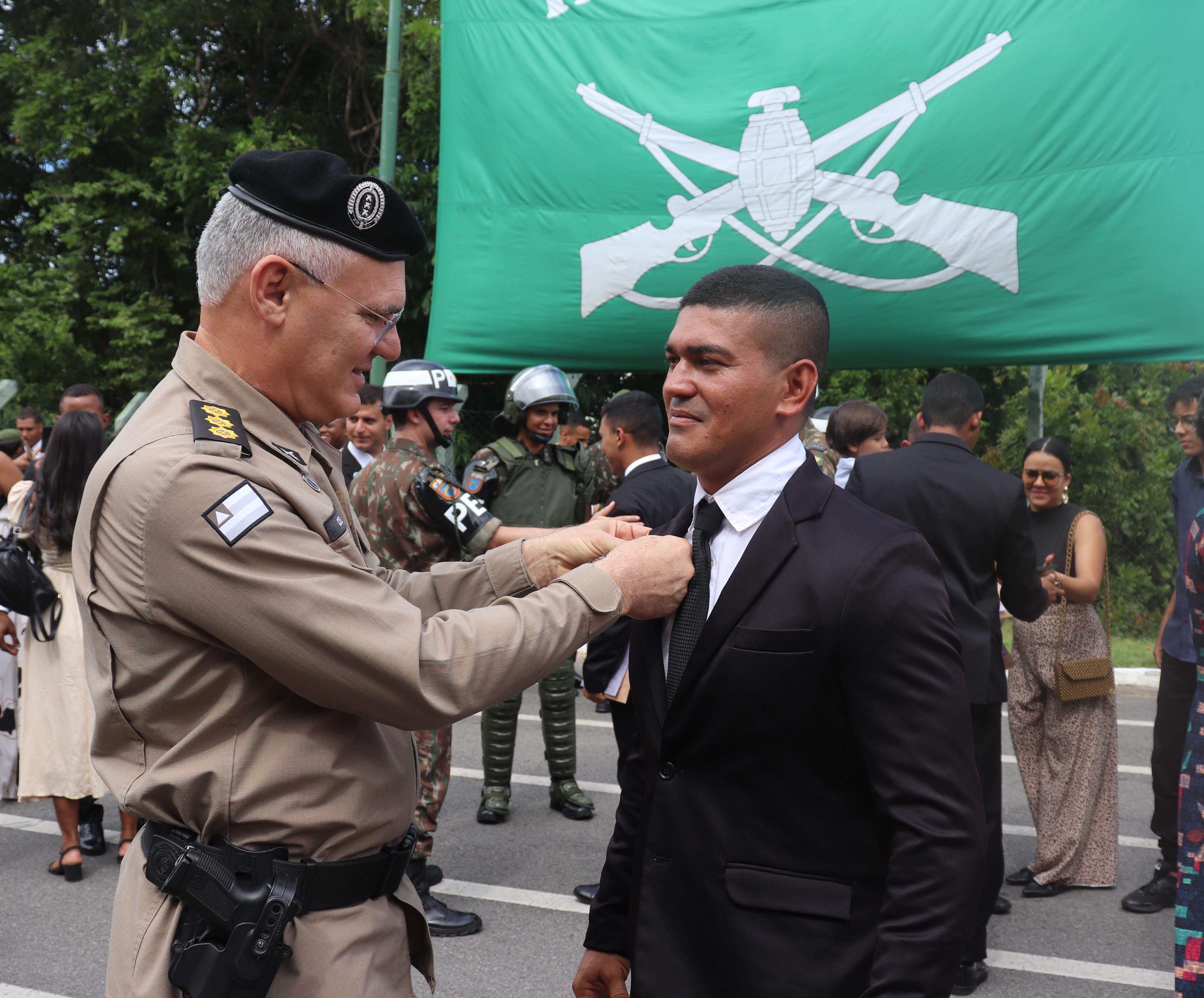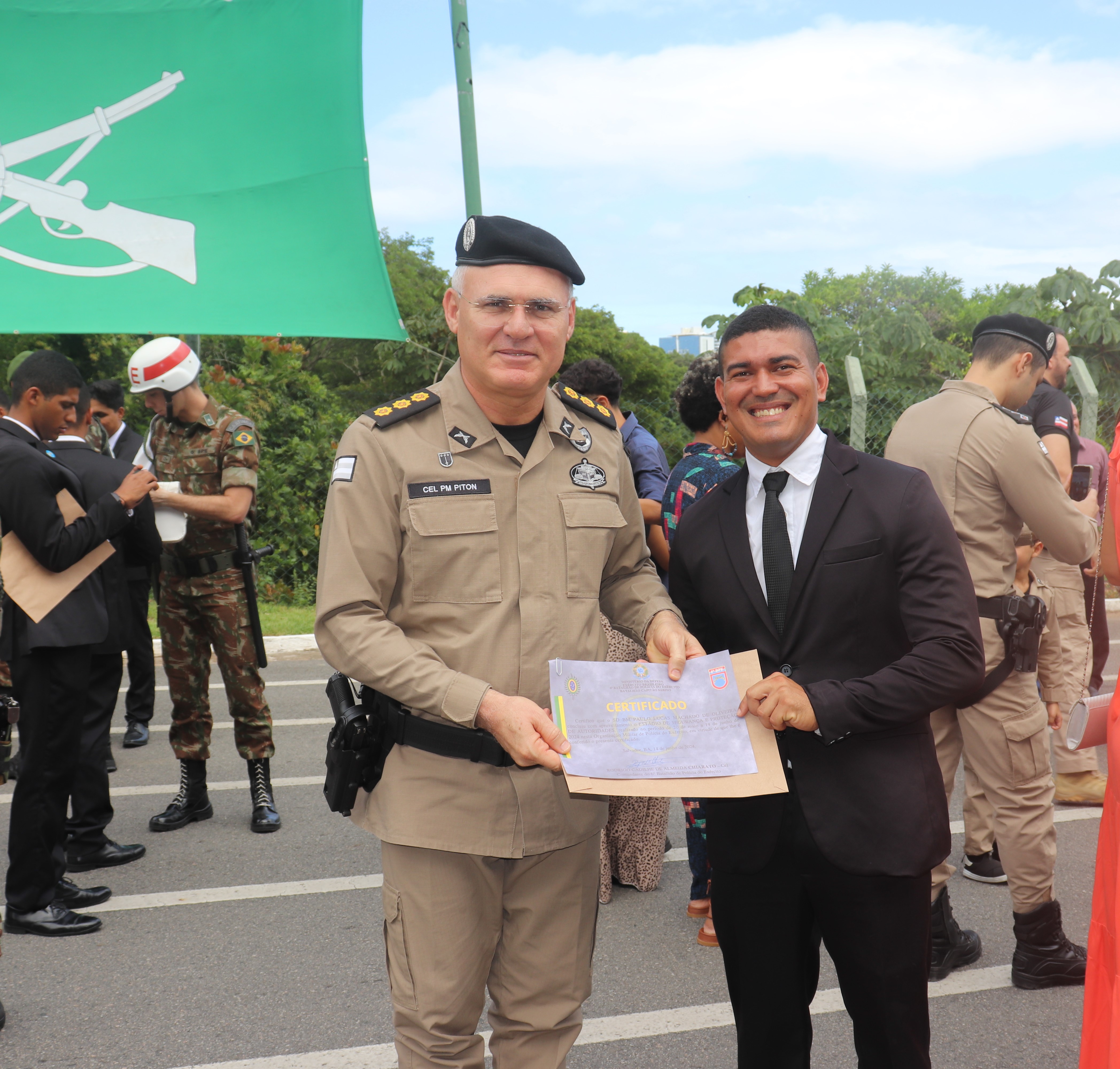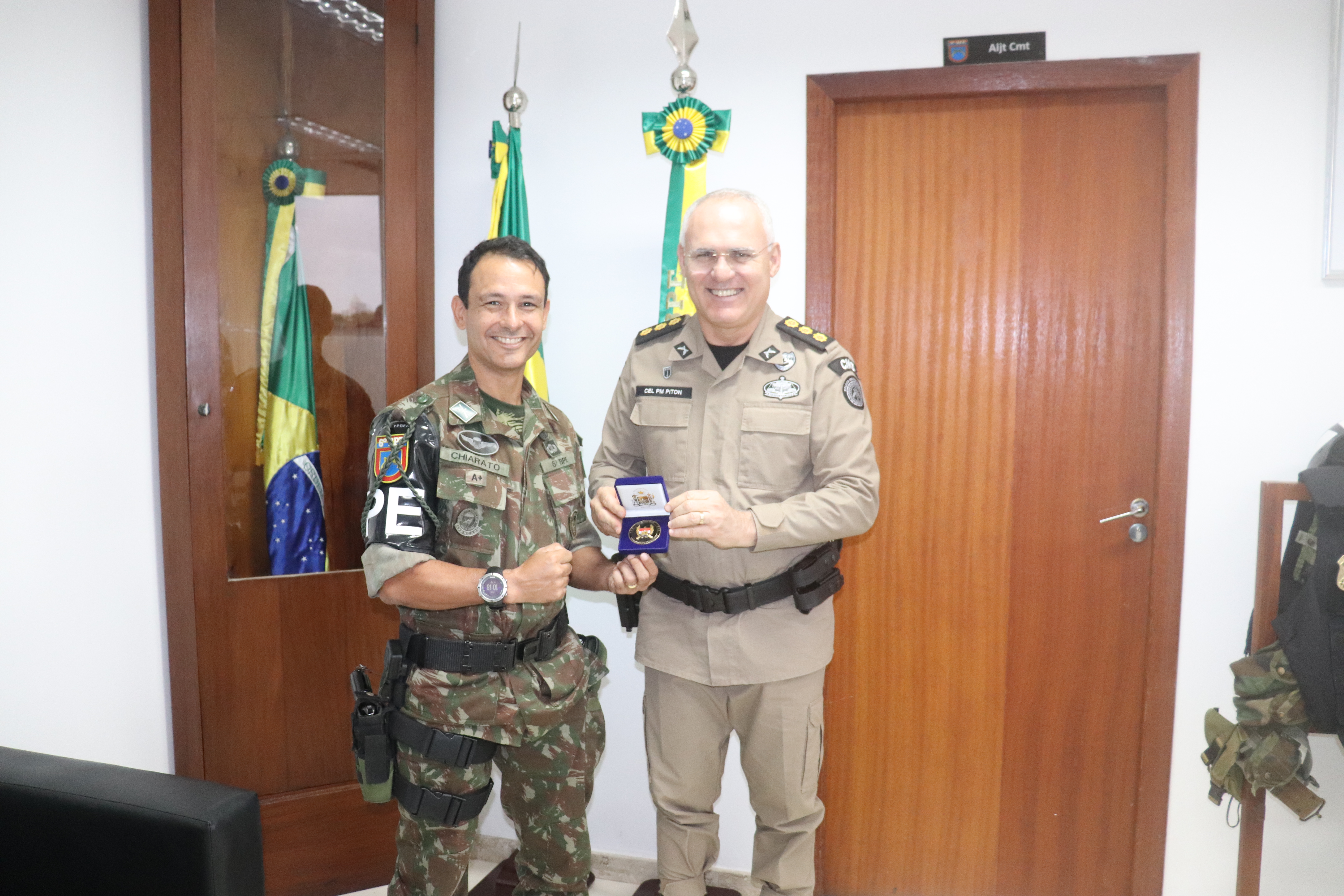 Na manhã desta sexta-feira (14), o Chefe Interino da CMG coronel Adalberto Piton, prestigiou a solenidade de conclusão do Estágio de Segurança e Proteção de Autoridades (ESPA) de dois policiais da CMG, os soldados Paulo Machado e Benival no 6° Batalhão de Polícia do Exército (BPE). Ao todo foram 24 formandos do curso de Segurança e Proteção de Autoridades. No evento, o coronel Adalberto Piton e o tenente-coronel Chiarato, comandante do 6º BPE, fizeram a troca das moedas entre as Instituições em forma de agradecimento.