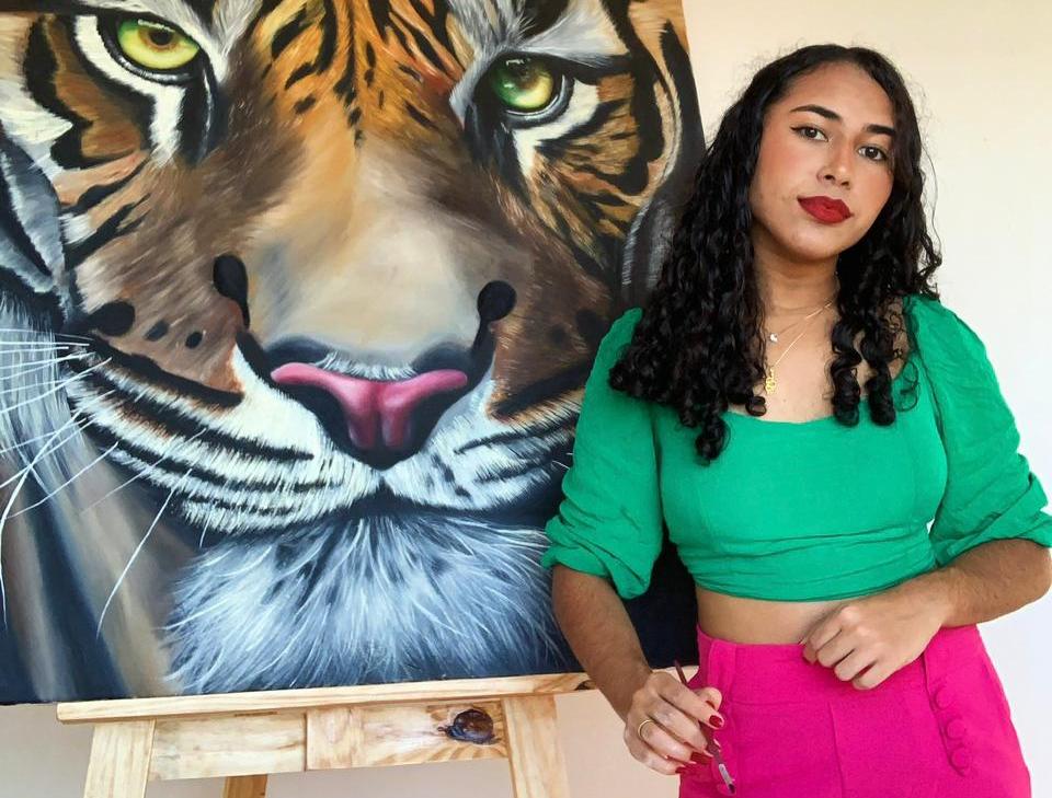 A estudante levará para o salão em Paris sua pintura a óleo com a temática que mais se identifica: a flora e fauna brasileiras. “Gosto de pintar animais e pessoas e de juntar os dois, pois o ser humano e a natureza estão conectados em cada mínimo detalhe. Por isso, sou apaixonada em retratar pessoas e animais. Sou autodidata e em toda a minha trajetória errar e refazer têm sido meus aliados no aprendizado. Sempre me arriscando em telas enormes fez com que eu atingisse o nível de realismo que pinto hoje”, revela.