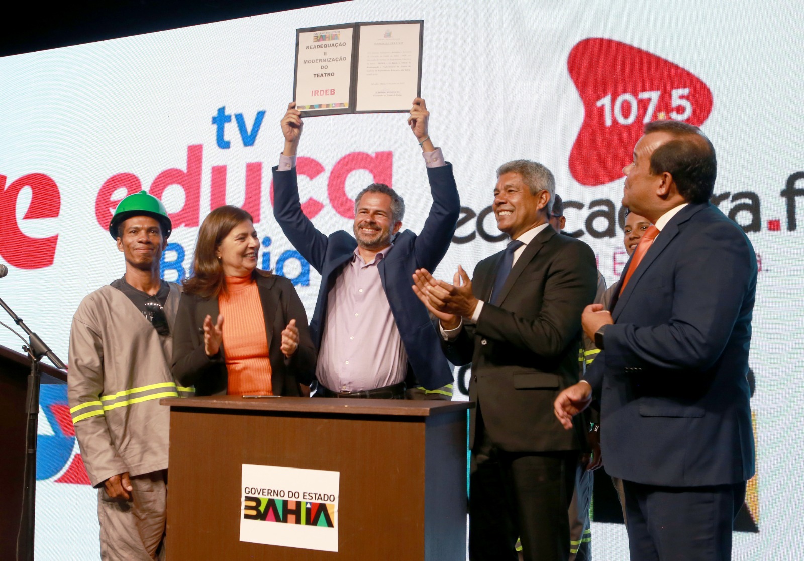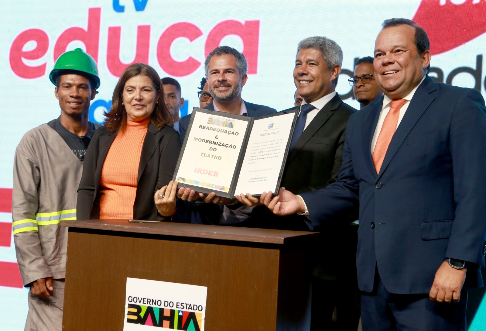 A ordem de serviço que autoriza o início das obras de requalificação do Teatro do Instituto de Radiodifusão Educativa da Bahia (Irdeb) foi assinada pelo governador Jerônimo Rodrigues, nessa segunda-feira (19), na sede do Irdeb, no bairro da Federação, em Salvador. A cerimônia de autorização para o início da intervenção, com recursos de R$ 4,5 milhões do Governo do Estado, contou ainda com a participação do vice-governador Geraldo Júnior, da secretária da Educação Adélia Pinheiro e do diretor-geral do Irdeb, Flávio Gonçalves.