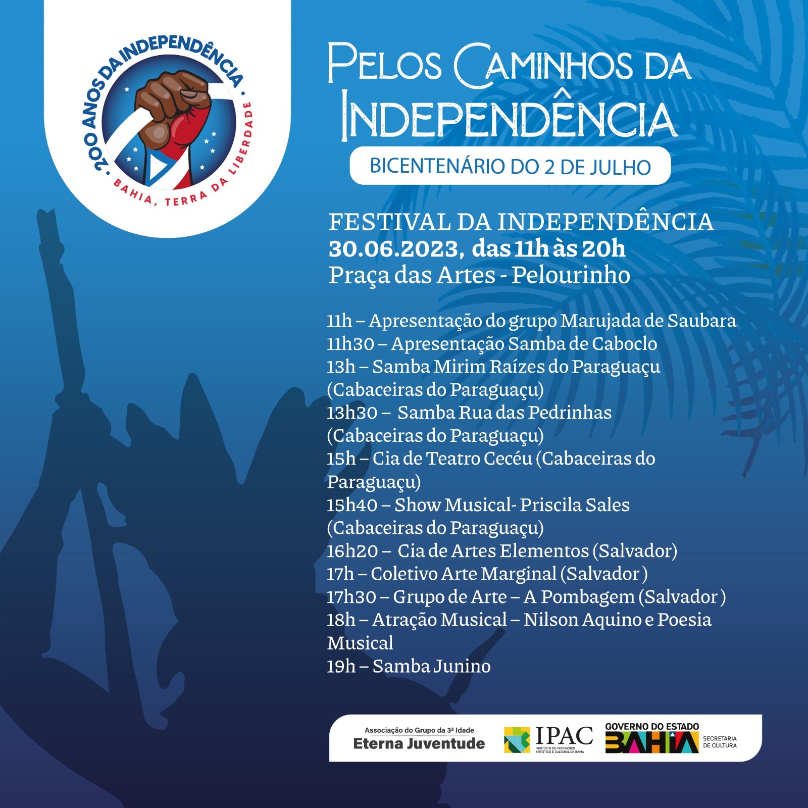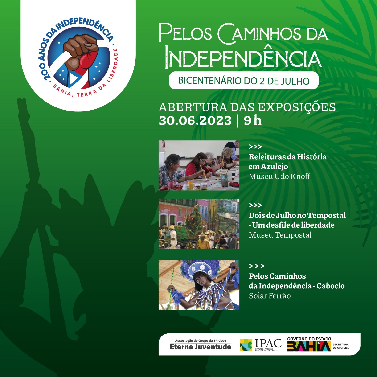 Pelos Caminhos da Independênciaé o tema adotado pelo IPAC para as celebrações nos museus Tempostal (Rua Gregório de Matos, 33), UdoKnoff (Rua Frei Vicente, 3) e no Centro Cultural Solar Ferrão (Rua Gregório de Matos, 45), para atrair baianos e turistas nesse marco histórico da Bahia. As atividades terão início às 10h e, ao longo de todo o dia, levarão música e animação, gratuitamente, para todos os que circularem pelas ruas do Pelourinho.