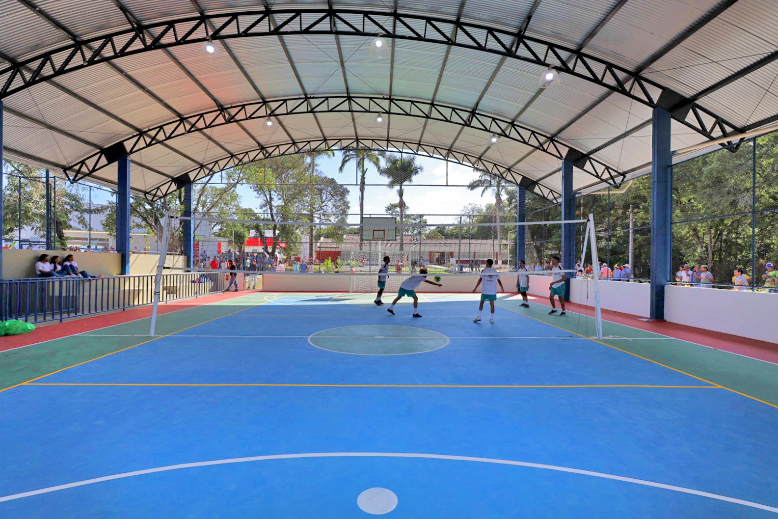 Com investimento de R$ 10,5 milhões, realizado por meio da Secretaria da Educação (SEC), a unidade ganhou teatro, restaurante, quadra poliesportiva coberta, campo de futebol society com pista de atletismo, banheiros e vestiários.