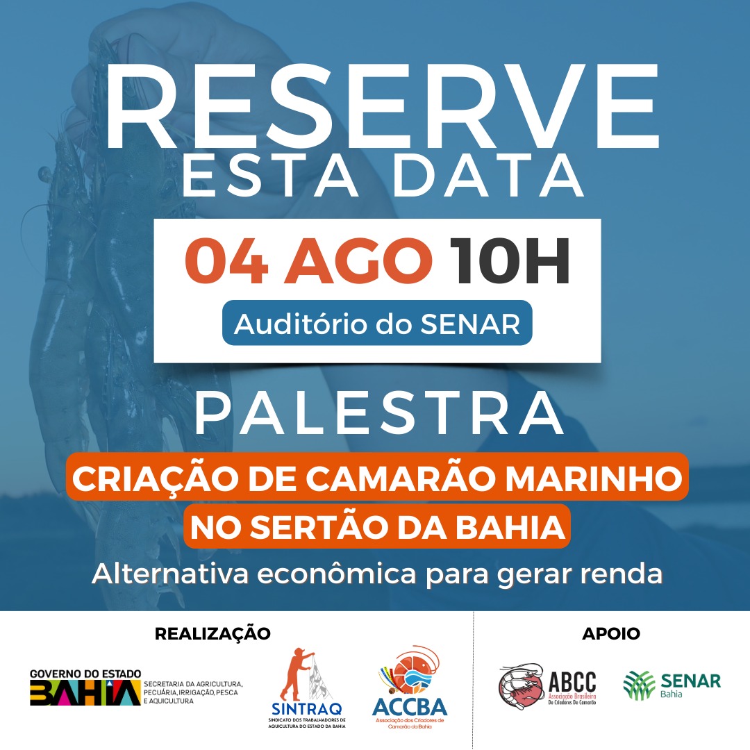 Alternativa econômica para garantir renda é o tema da palestra criação de camarão marinho no sertão baiano. O evento acontece na próxima sexta-feira (4), às 10h, no auditório do Serviço Nacional de Aprendizagem Rural (Senar), no bairro do Comércio, em Salvador. A iniciativa tem realização da Secretaria da Agricultura, Pecuária, Irrigação, Pesca e Aquicultura (Seagri), Sindicato dos Trabalhadores de Aquicultura do Estado da Bahia e Associação dos Criadores de Camarão da Bahia (ACCBA). As inscrições são gratuitas e devem ser realizadas através do e-mail sintraq.ba@gmail.com ou pelo whatsApp (71) 9 9154-0690.