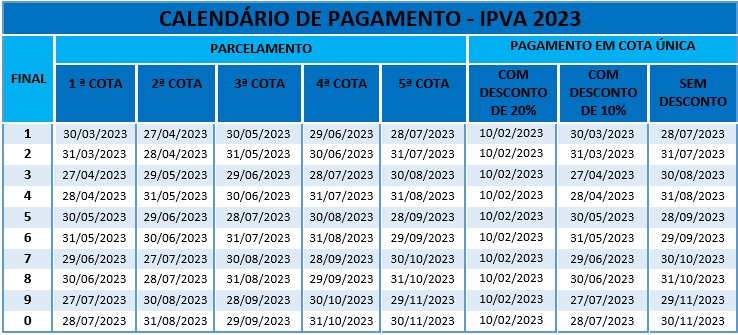 Para realizar o pagamento, o contribuinte deve ir até uma agência, um caixa eletrônico ou então utilizar o aplicativo ou o site do Banco do Brasil, Bradesco ou Sicoob, bastando apenas apresentar o número do Renavam. Os demais prazos para cota única no decorrer do ano são os seguintes: 28/9 para placas de final 5, 29/09 (final 6), 30/10 (final 7), 31/10 (final 8), 29/11 (final 9) e 30/11 (final 0), além das já citadas placas 3, no dia 30/08, e placa 4, no dia 31/08.