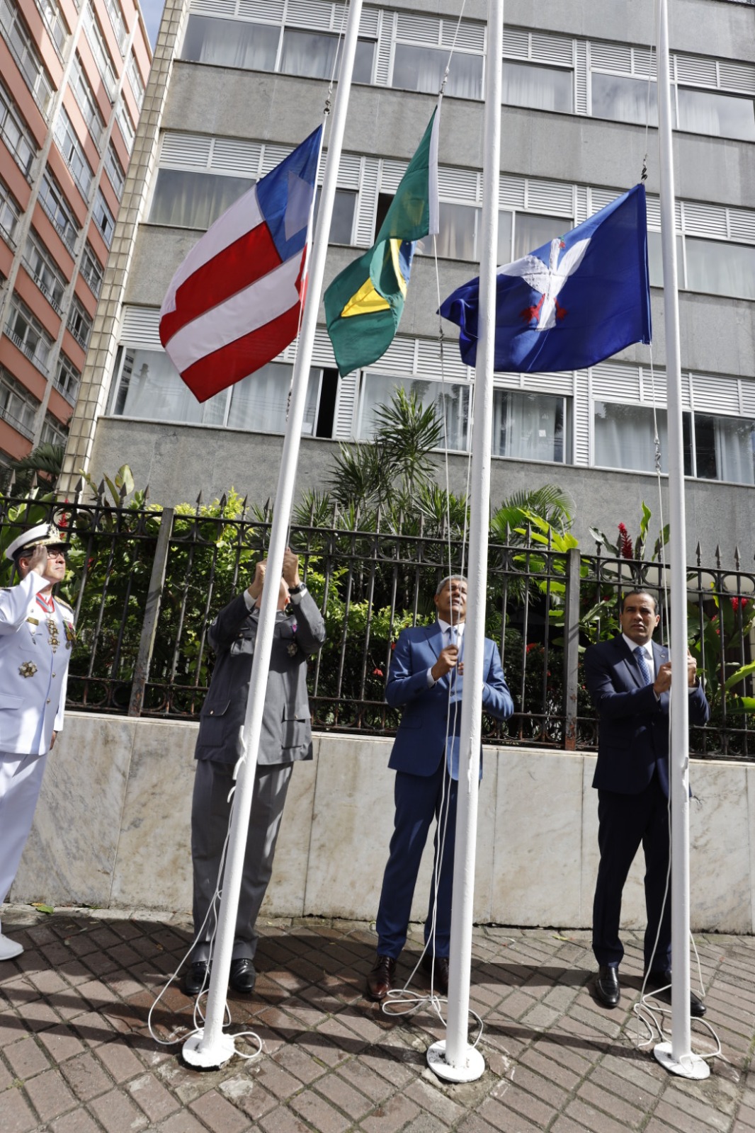 O governador Jerônimo Rodrigues participou pela primeira vez da cerimônia de hasteamento das bandeiras ao lado de outras autoridades, e falou do papel da Bahia na construção de um país soberano desde sua independência.
