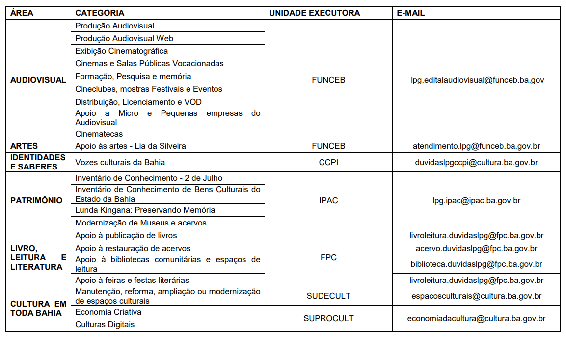Os 26 editais da Paulo Gustavo Bahia estão com as inscrições abertas até às 17h59 do dia 25 de outubro. Para mais informações, acesse o site da Secult-BA (http://www.cultura.ba.gov.br/), onde encontrará detalhes sobre cada edital. As dúvidas também podem ser sanadas através do telefone: (71) 3103-3256 e pelos e-mails dos respectivos editais (lista abaixo).