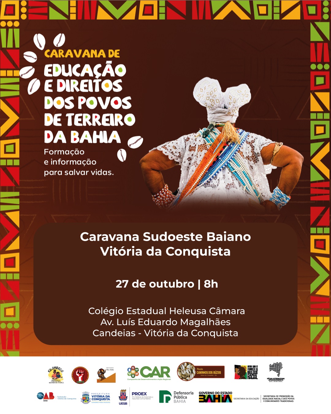 A Caravana de Educação em Direitos dos Povos de Terreiro da Bahia, iniciativa da Secretaria de Promoção da Igualdade Racial e dos Povos e Comunidades Tradicionais (Sepromi) e da Defensoria Pública do Estado (DPE), chega a Vitória da Conquista nesta sexta-feira (27). A atividade reunirá povos de terreiro de diversos municípios do sudoeste baiano para um ciclo de formação, das 7h30 às 17h, no Colégio Estadual Profª. Heleusa Figueira Câmara, localizado no bairro Candeias.