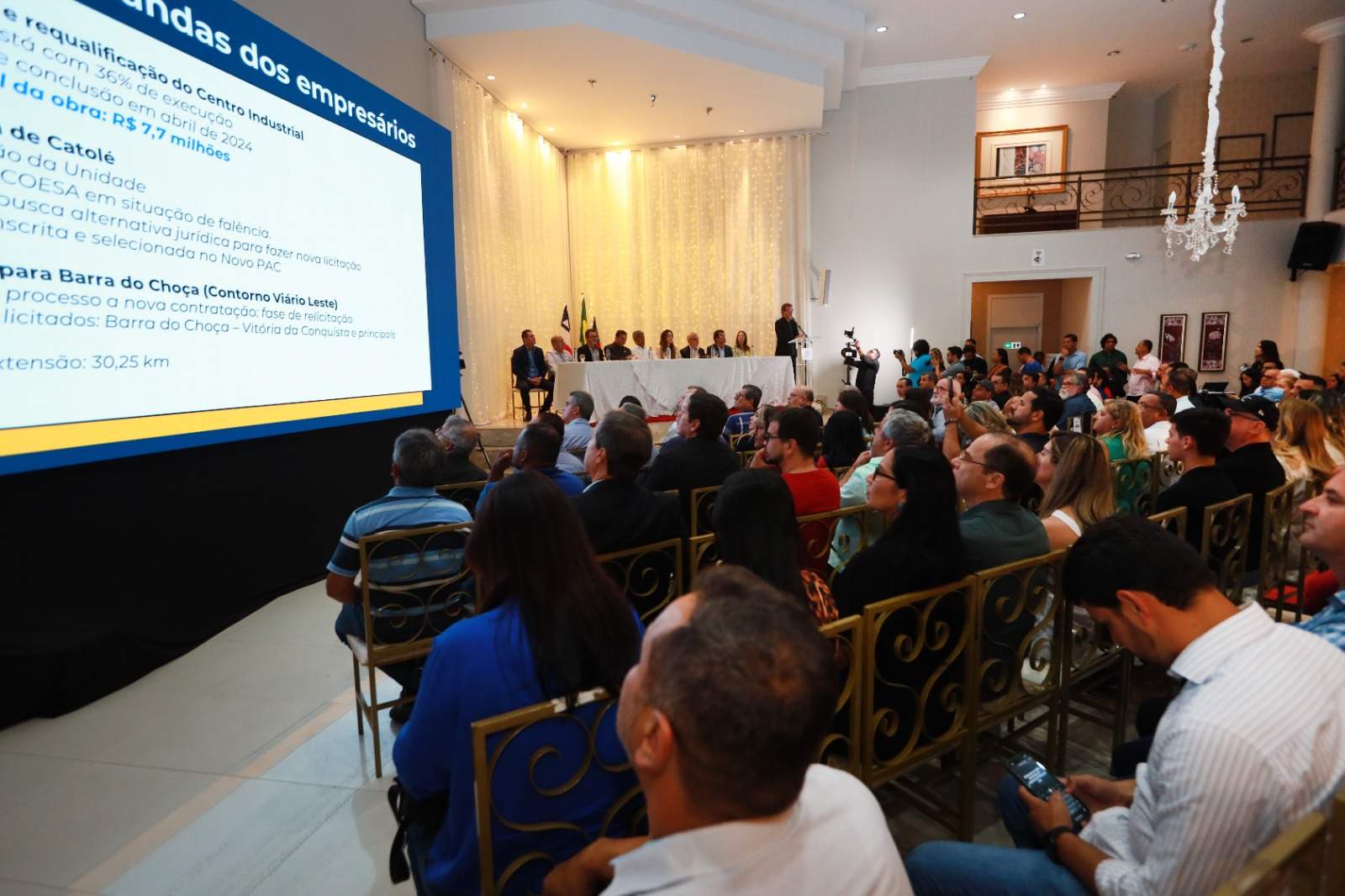 O governador Jerônimo Rodrigues participou de reunião, na noite desta sexta-feira (10), com empresários da região de Vitória da Conquista, no auditório da Casa de Eventos Limão Doce. O encontro teve como objetivo discutir ações para impulsionar o desenvolvimento não apenas do município, mas de toda a região. Estiveram presentes secretários estaduais e representantes da Associação das Indústrias de Vitória da Conquista (AINVIC), além da primeira-dama Tatiana Veloso.