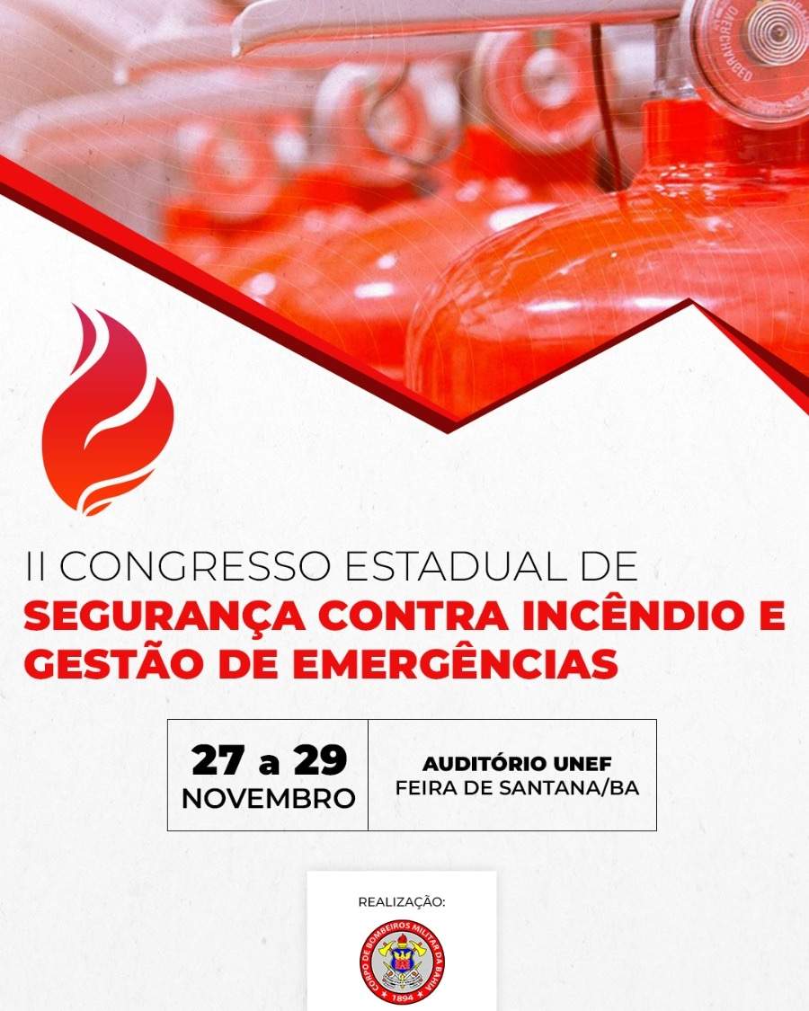 De 27 a 29 de novembro, o Corpo de Bombeiros Militar da Bahia (CBMBA) vai realizar o II Congresso Estadual de Segurança contra Incêndio e Gestão de Emergências. A atividade vai acontecer na Unidade de Ensino Superior de Feira de Santana (Unef) e tem como objetivo a integração da instituição com a sociedade através da cultura da prevenção de acidentes e incêndios.