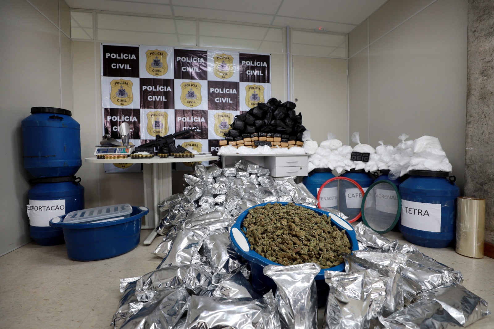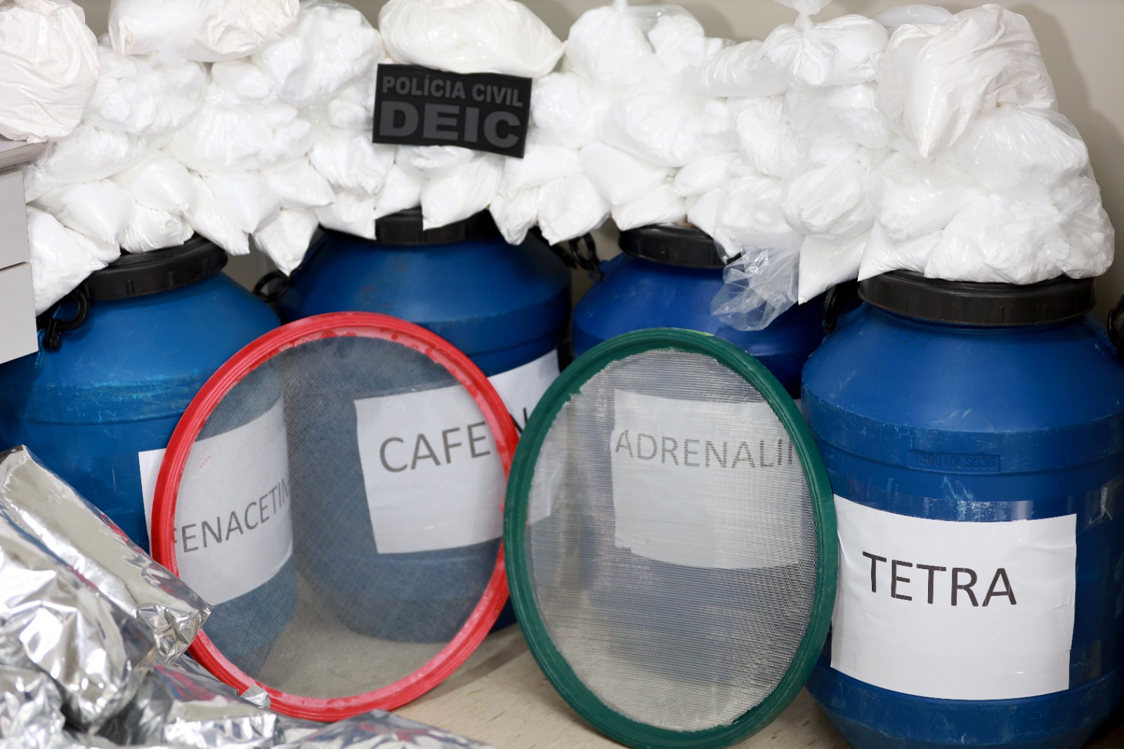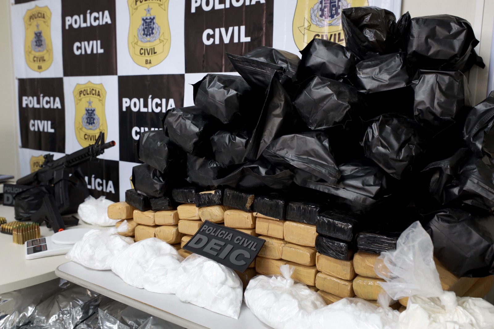 A Polícia Civil da Bahia (PC-BA), por meio do Departamento Especializado de Investigações Criminais (Deic) – em entrevista coletiva concedida na manhã desta quarta-feira (22), na sede da companhia, em Salvador –, deu detalhes da operação que desarticulou, na última terça-feira (21), um laboratório de drogas montado dentro de uma casa de veraneio na Praia de Ipitanga, também na capital baiana. No local, foram encontrados pacotes contendo maconha, tambores com porções de um pó branco semelhante à cocaína, cerca de mil munições dos calibres de fuzil 556, ponto 40,9 mm e 380, além da quantia de R$ 3 mil em dinheiro, duas balanças de precisão, maquinário e insumos para a produção e refino dos entorpecentes.
