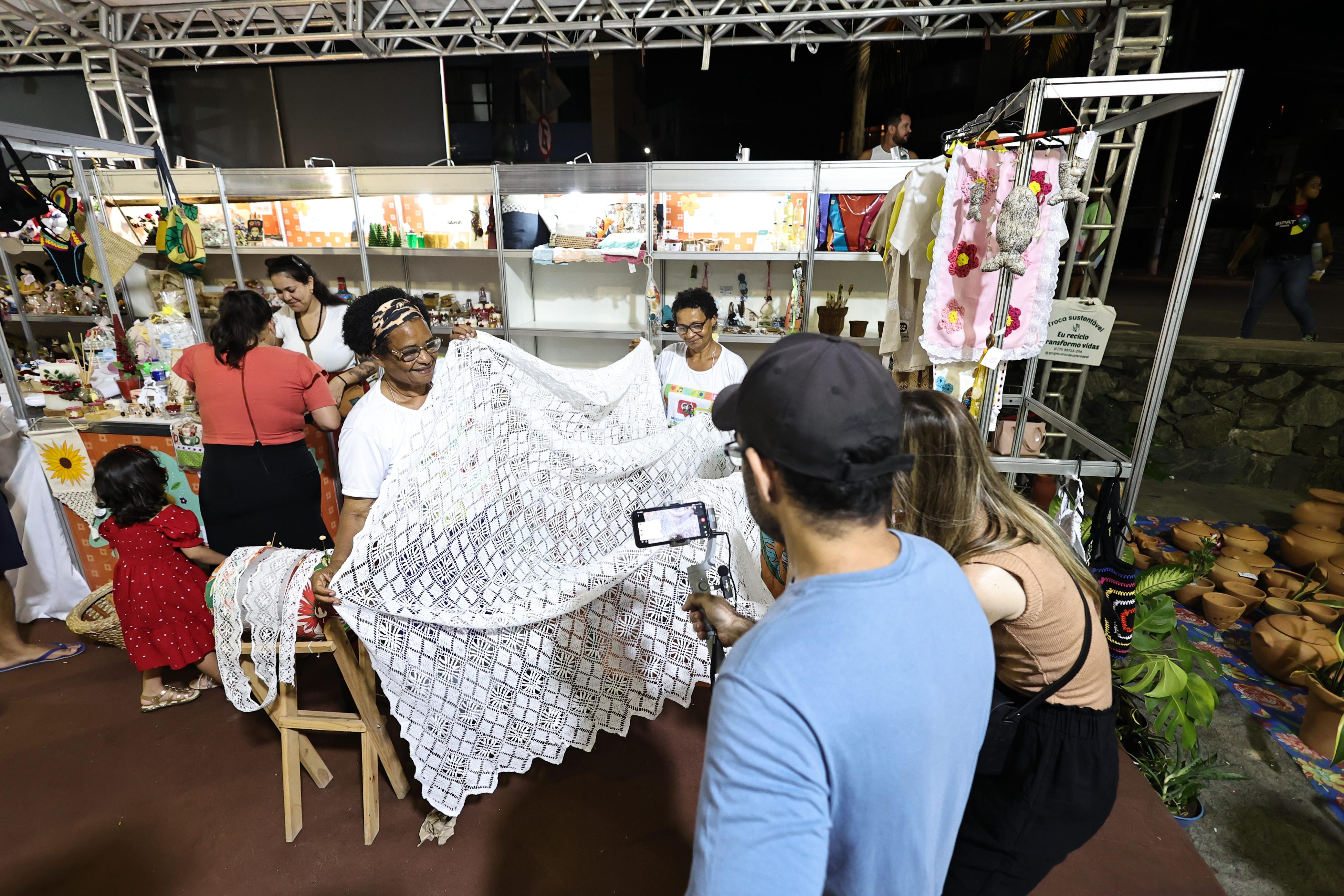 Quem visitou a Tenda do Artesanato teve ainda a oportunidade de conhecer Dinoélia, da Associação das Rendeiras (Rendavan) de Dias D’Ávila, do território de identidade Metropolitano de Salvador, que é mestra imortal em renda de Bilro pela Unesco, “Para mim, estar aqui fazendo parte desse evento maravilhoso, junto com minha bandeira, que é a do artesanato tradicional, é de grande relevância para mim. É uma oportunidade muita rica estar aqui apresentando a nossa cultura”.