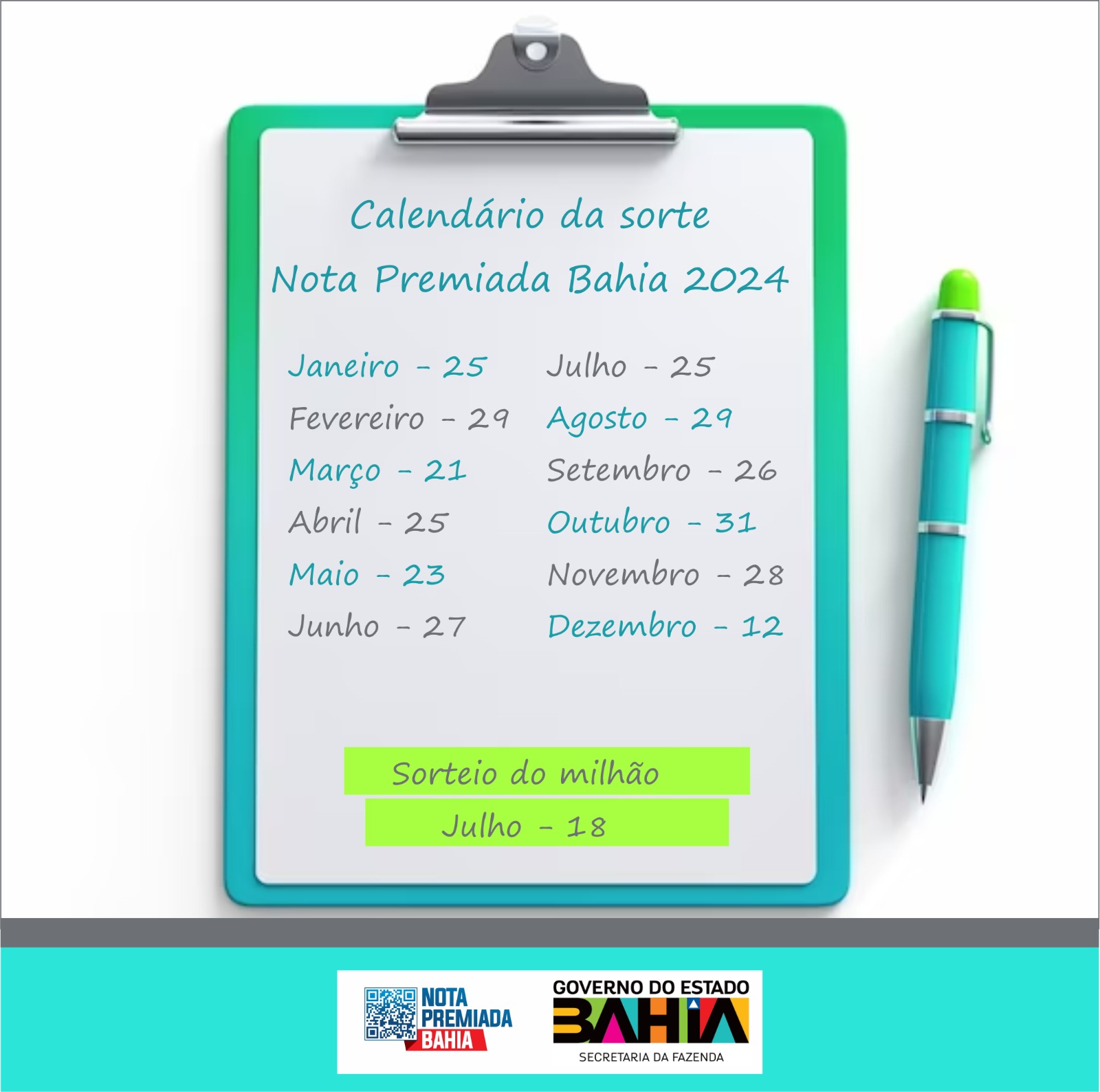 O calendário com as datas de realização dos sorteios da Nota Premiada Bahia em 2024 já pode ser conferido pelos participantes no Instagram @notapremiadabahia, no site www.notapremiadabahia.ba.gov.br e nas redes sociais da Secretaria da Fazenda da Bahia (Sefaz-BA), responsável pela campanha: @sefazbahia no Instagram, @sefaz.govba e no Twitter @sefazbahia.