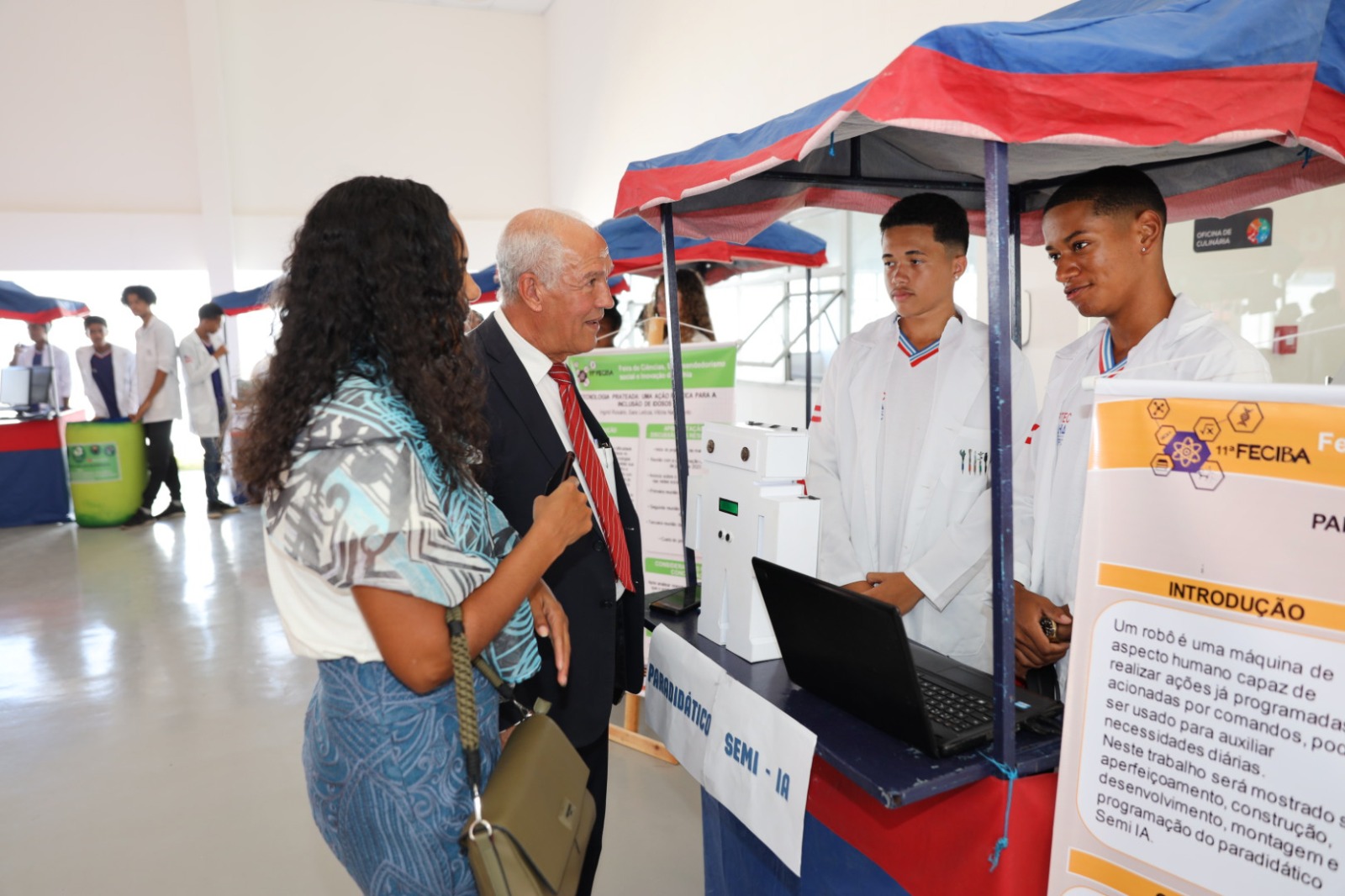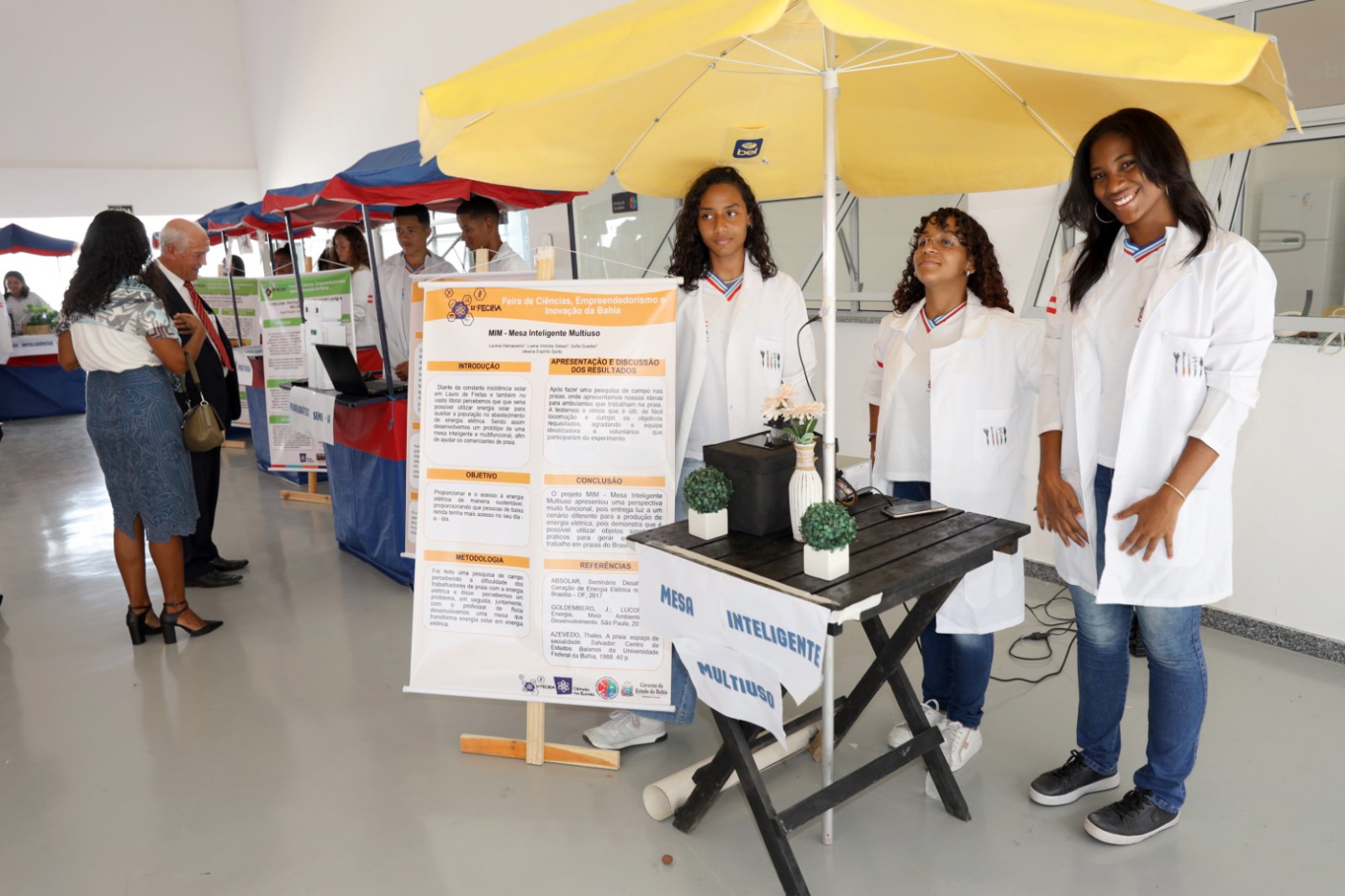 A exposição de sete projetos científicos reuniu os trabalhos apresentados na Feira de Ciência promovida para estudantes do curso profissionalizante de Manutenção e Suporte em Informática. O ministro Barroso e o governador em exercício conheceram os trabalhos apresentados pelos estudantes. Um dos projetos foi a Mesa Multifuncional Inteligente (MMI), que transforma energia solar em energia elétrica a serviço dos trabalhadores ambulante das praias com múltiplas funcionalidades.