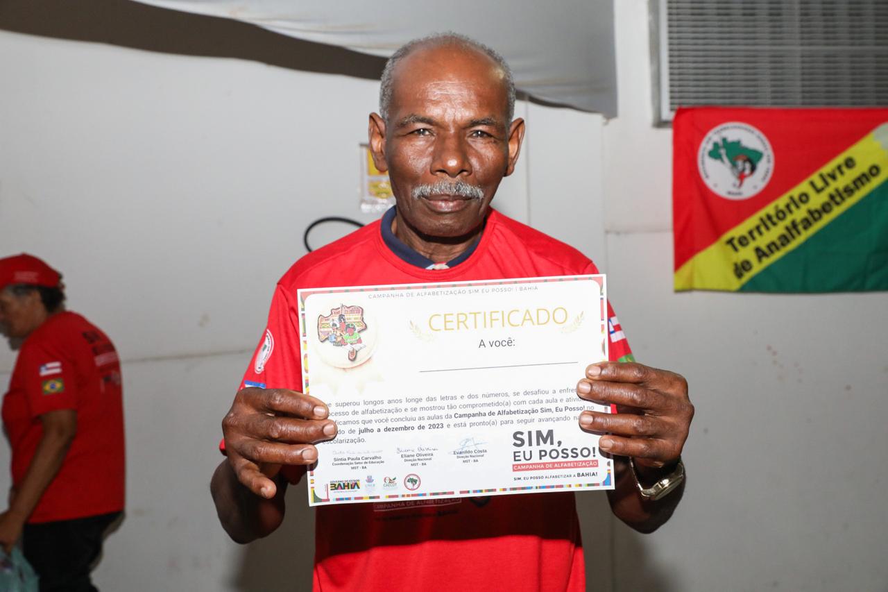 Durante a formatura, estudantes subiram ao palco para receberem seus certificados das mãos da secretária da Educação e dos representantes da Uneb e do MST. Manoel Lourenço de Oliveira, 74 anos, que se formou junto com a sua esposa, Marileide Miranda de Oliveira, expressou sua alegria ao receber seu diploma: “eu estou muito alegre, pois é uma conquista que eu nunca tive na minha vida. Quando eu era pequeno, pedia pro meu pai para ir à escola e ele não deixava. Era muito triste pra mim. Somente depois de adulto que consegui me alfabetizar. Agora eu consigo fazer coisas que não conseguia fazer antes, como ler os nomes nos ônibus, sem precisar perguntar pra ninguém. Eu tô muito feliz”.