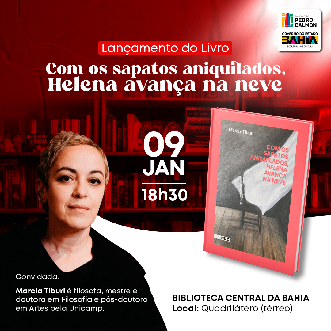 O mais novo romance da filósofa, artista e escritora Marcia Tiburi, “Com os Sapatos Aniquilados, Helena Avança Na Neve”, livro que já está nas livrarias desde agosto de 2023, será lançado em Salvador, na Biblioteca Central do Estado da Bahia (BCEB), unidade da Fundação Pedro Calmon (FPC/SecultBA). O lançamento acontece nesta terça-feira, 09, às 18h30, no Quadrilátero (térreo) da BCEB.