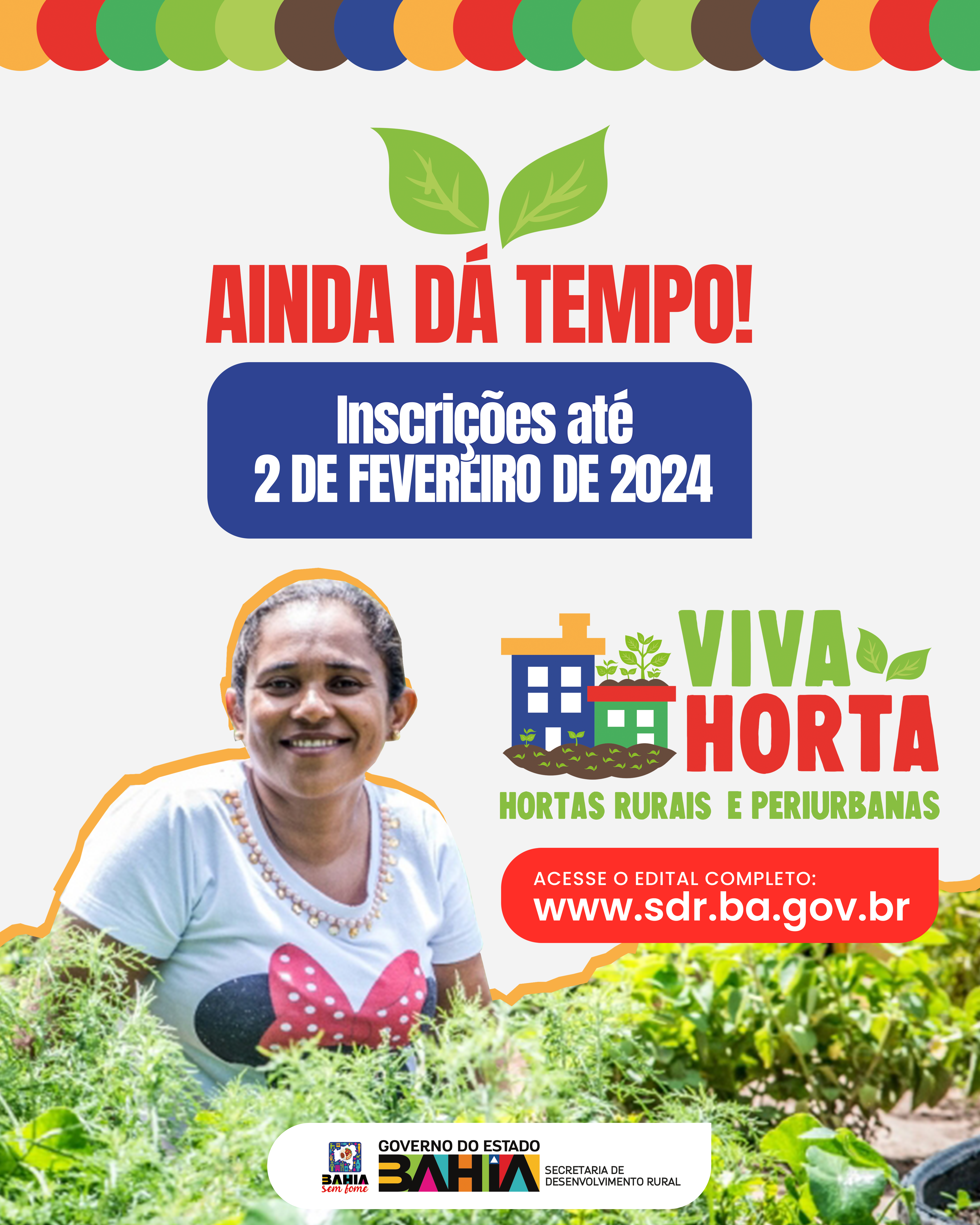 O prazo de inscrições para o edital Viva Horta se encerra nesta sexta-feira, 2 de fevereiro. O edital da Secretaria de Desenvolvimento Rural (SDR) tem o objetivo de implantar hortas comunitárias rurais e periurbanas nos Territórios de Identidade da Bahia, promovendo a segurança alimentar e a geração de renda para as famílias envolvidas.