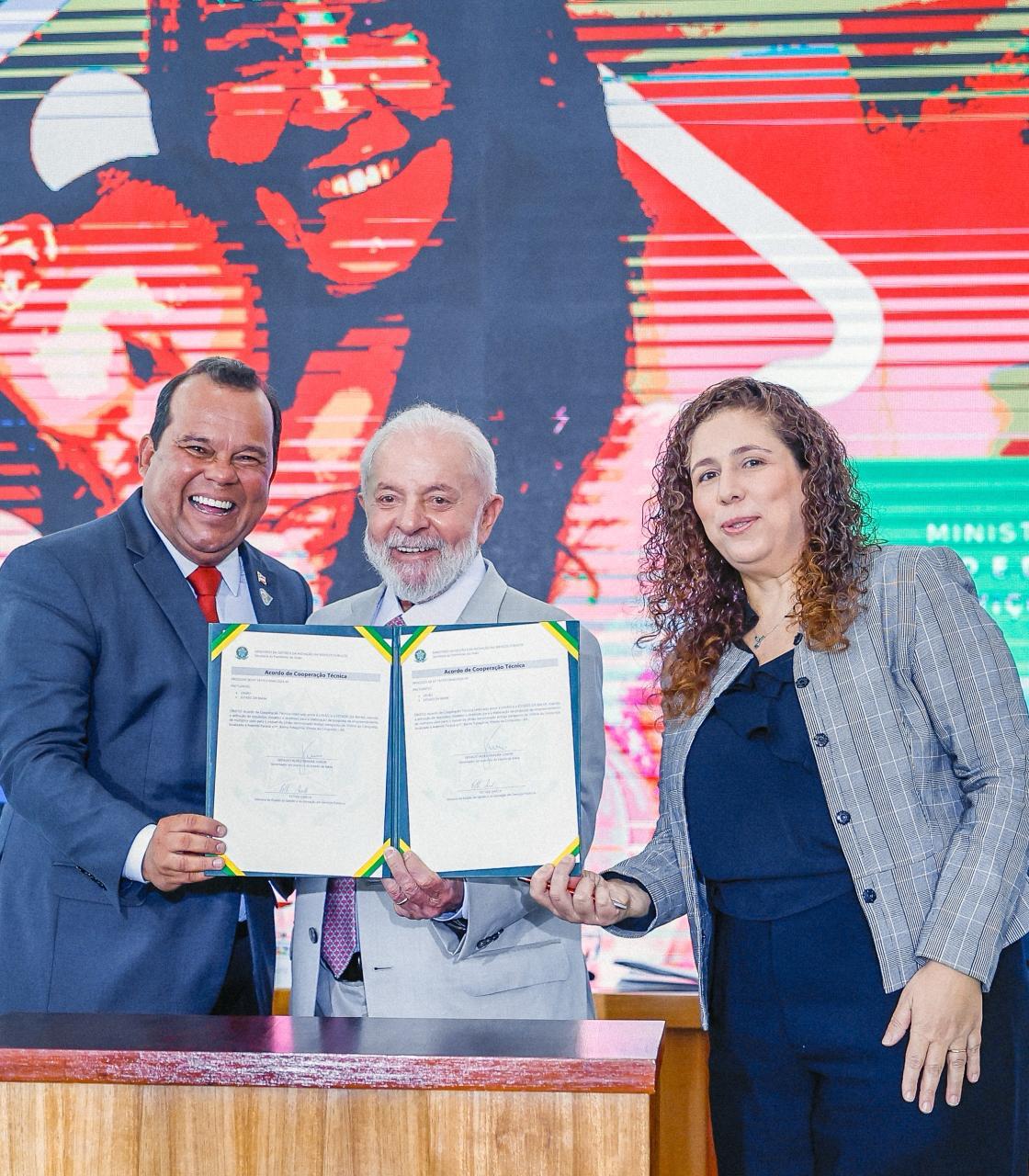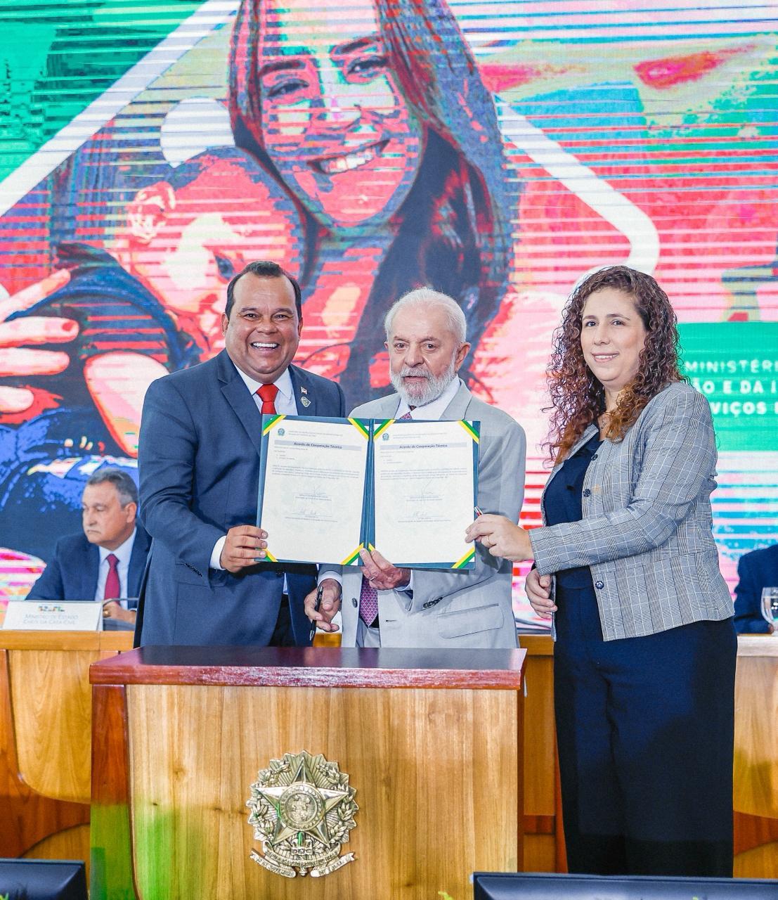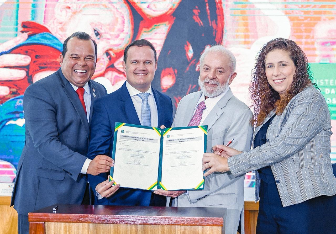 O governador da Bahia em exercício, Geraldo Júnior, esteve, nesta segunda-feira (26), no Palácio do Planalto, ao lado do presidente da República, Luiz Inácio Lula da Silva, e dos ministros da Casa Civil, Rui Costa, e da Gestão e da Inovação em Serviços Públicos do Brasil (MGI), Esther Dweck, para o lançamento do programa Imóvel da Gente. A cerimônia destacou as entregas de atos relacionados aos municípios baianos de Amargosa e Vitória da Conquista.