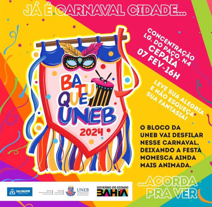 O evento, realizado pelas Assessorias Especial de Cultura e Artes (Ascult) e de Comunicação (Ascom) da Uneb, tem o apoio da Prefeitura Municipal de Salvador e do Governo da Bahia. Vista a sua fantasia e venha ver o bloco da universidade de toda a Bahia desfilar a sua alegria no maior carnaval do mundo.