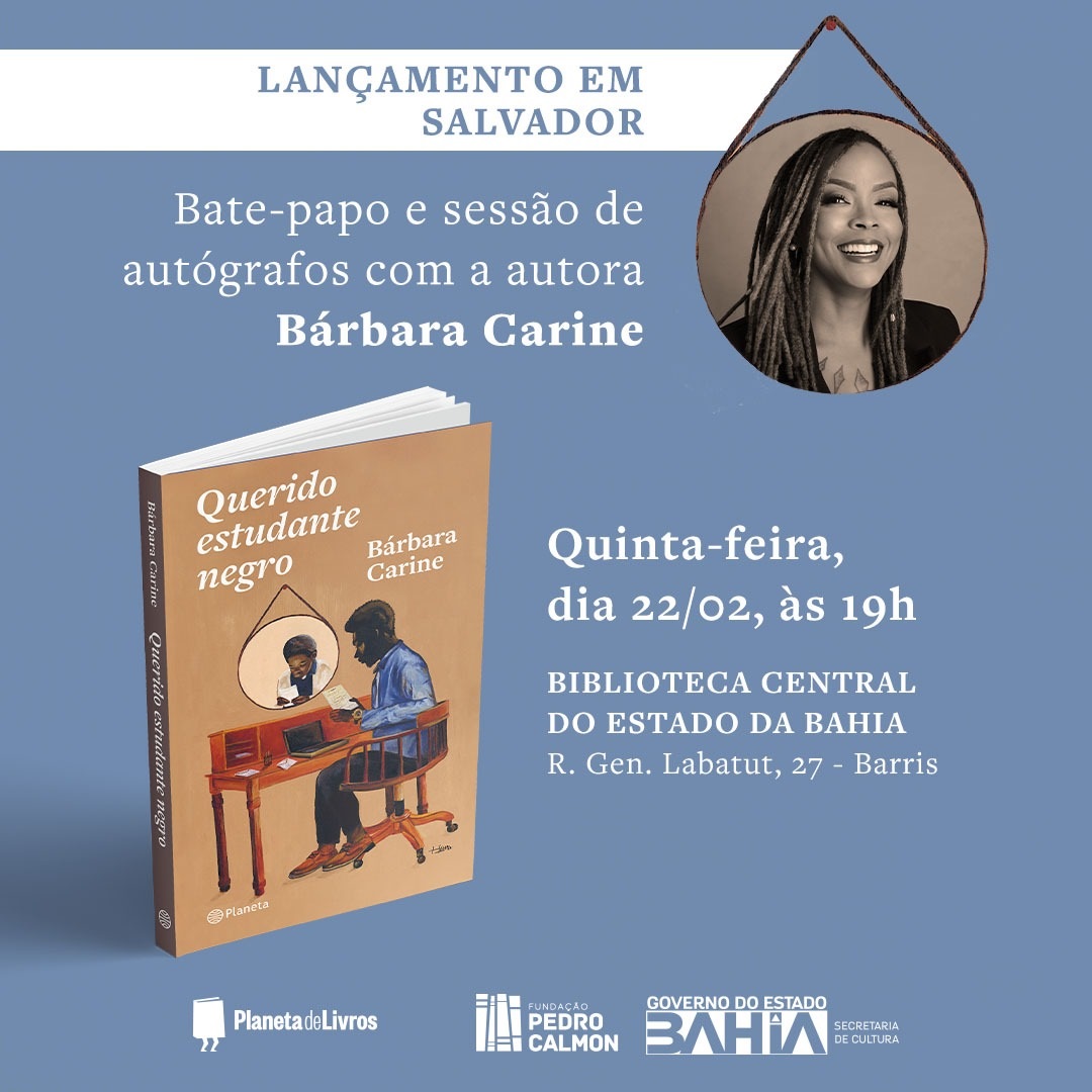 Nesta quinta-feira (22), a Biblioteca Central do Estado da Bahia (BCEB), unidade da Fundação Pedro Calmon (FPC/Secult-BA), recebe o lançamento do livro Querido Estudante Negro, da escritora, pesquisadora e educadora, Bárbara Carine. O evento acontece às 19h, com um bate-papo da autora com o público, seguido de sessão de autógrafos.