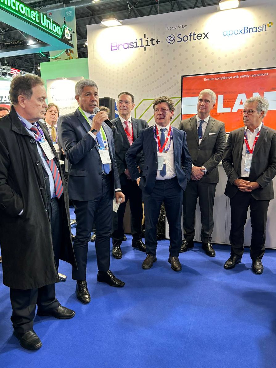 No último compromisso do dia, Jerônimo participou de cerimônia no estande brasileiro no MWC 2024. Chamado de “Brasil it+”, o espaço do Brasil reúne 21 startups nacionais com diferentes projetos tecnológicos.