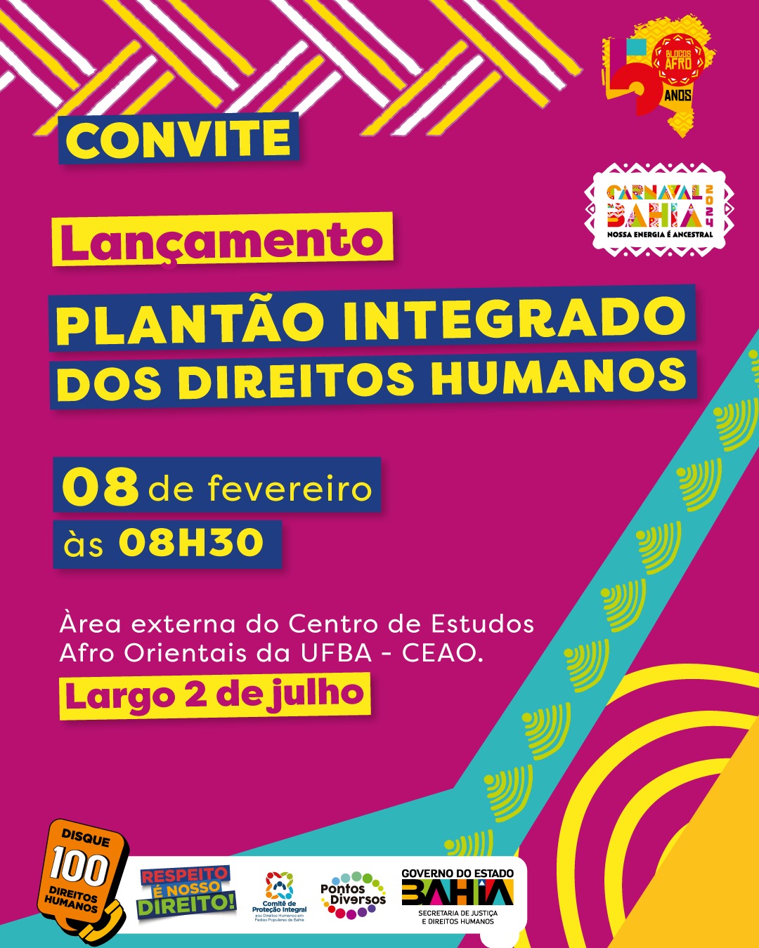 Através do Projeto Direitos Humanos nos Eventos Populares da Bahia, a SJDH atua em eventos com a estratégia do Plantão Integrado e/ou com as mobilizações da campanha Respeito é Nosso Direito. Carnavais, Micaretas, festas de largo e São João são exemplos de grandes festivais de rua em que há atuação da pasta para combater violações e promover uma festa popular para todas as pessoas, com proteção e defesa de seus direitos.