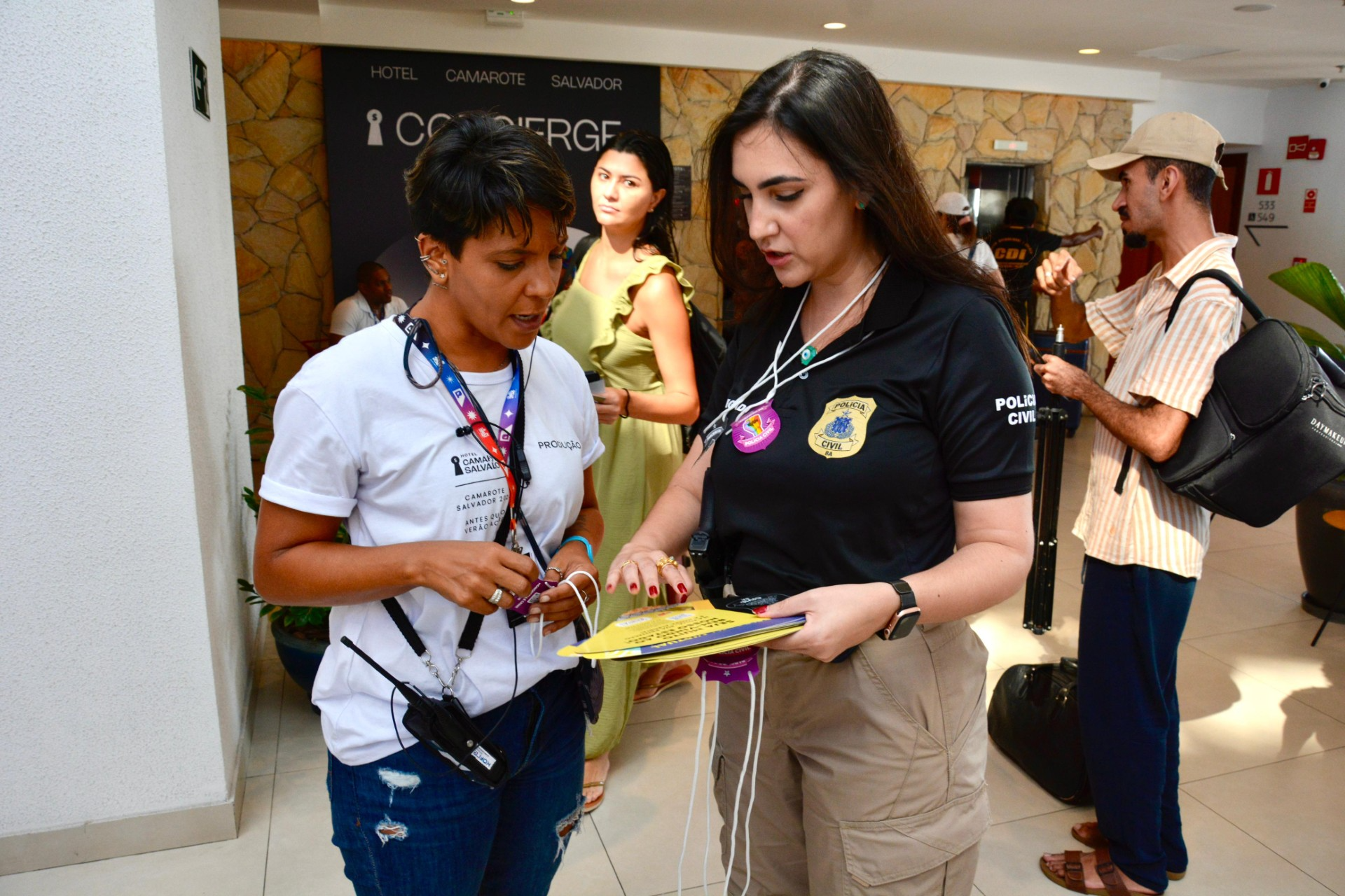 A Polícia Civil da Bahia, por meio da Delegacia de Proteção ao Turista (Deltur) realizou, nesta quinta-feira (8), em diversos estabelecimentos hoteleiros, uma ação de esclarecimentos para os turistas que chegaram a Salvador. Os recém-chegados, principalmente aqueles que vieram curtir o carnaval, receberam dicas de segurança do que levar para os circuitos e da localização dos postos.