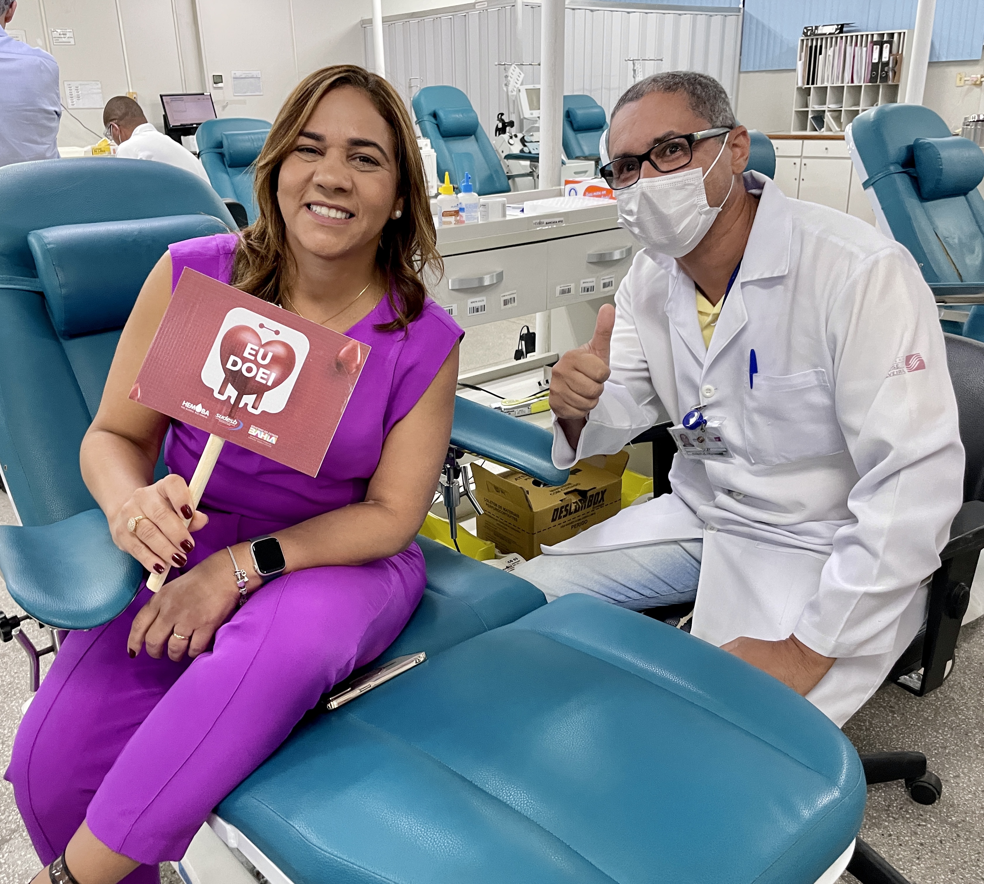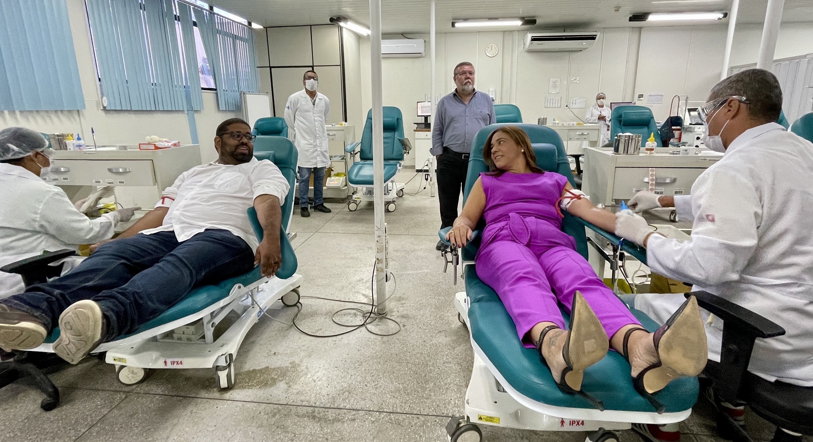 A secretária da Saúde, Roberta Santana, e o secretário de Justiça e Direitos Humanos, Felipe Freitas, foram até a Hemoba para doar sangue.