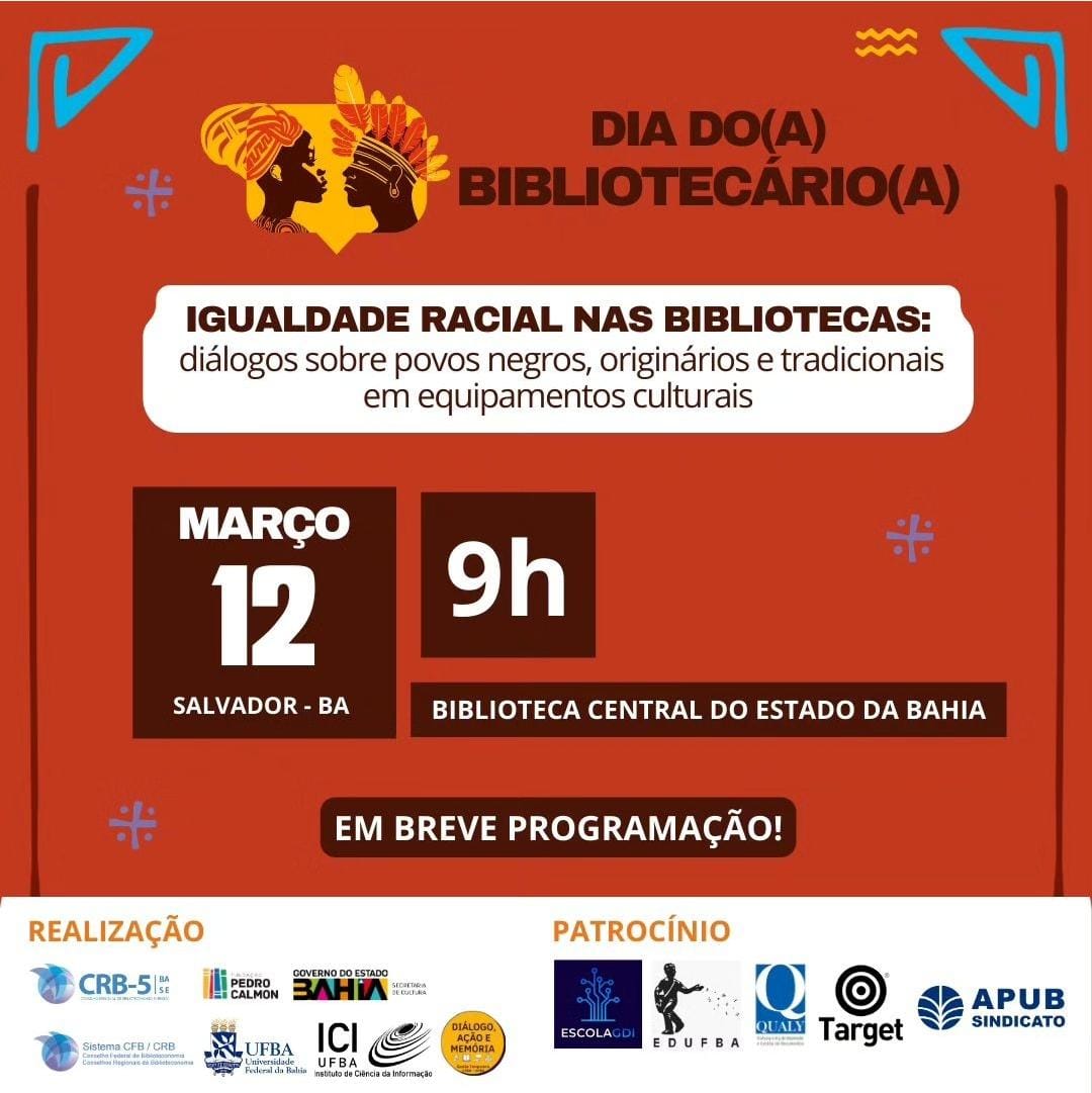 Em comemoração ao Dia do Bibliotecário, a Fundação Pedro Calmon (FPC), unidade da Secretaria de Cultura da Bahia (Secult-BA), promove evento com o tema central “Igualdade racial nas bibliotecas: diálogos sobre os povos negros, originários e tradicionais em equipamentos culturais”. A atividade acontece no dia 12, às 9h, em formato híbrido: presencial, na Biblioteca Central do Estado da Bahia (BCEB), e transmitida pelo canal da FPC no YouTube. Os interessados devem se inscrever pelo site fpc.ba.gov.br.