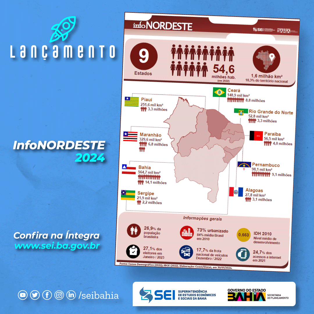 A Superintendência de Estudos Econômicos e Sociais da Bahia (SEI) apresenta a atualização do Info Nordeste 2024.