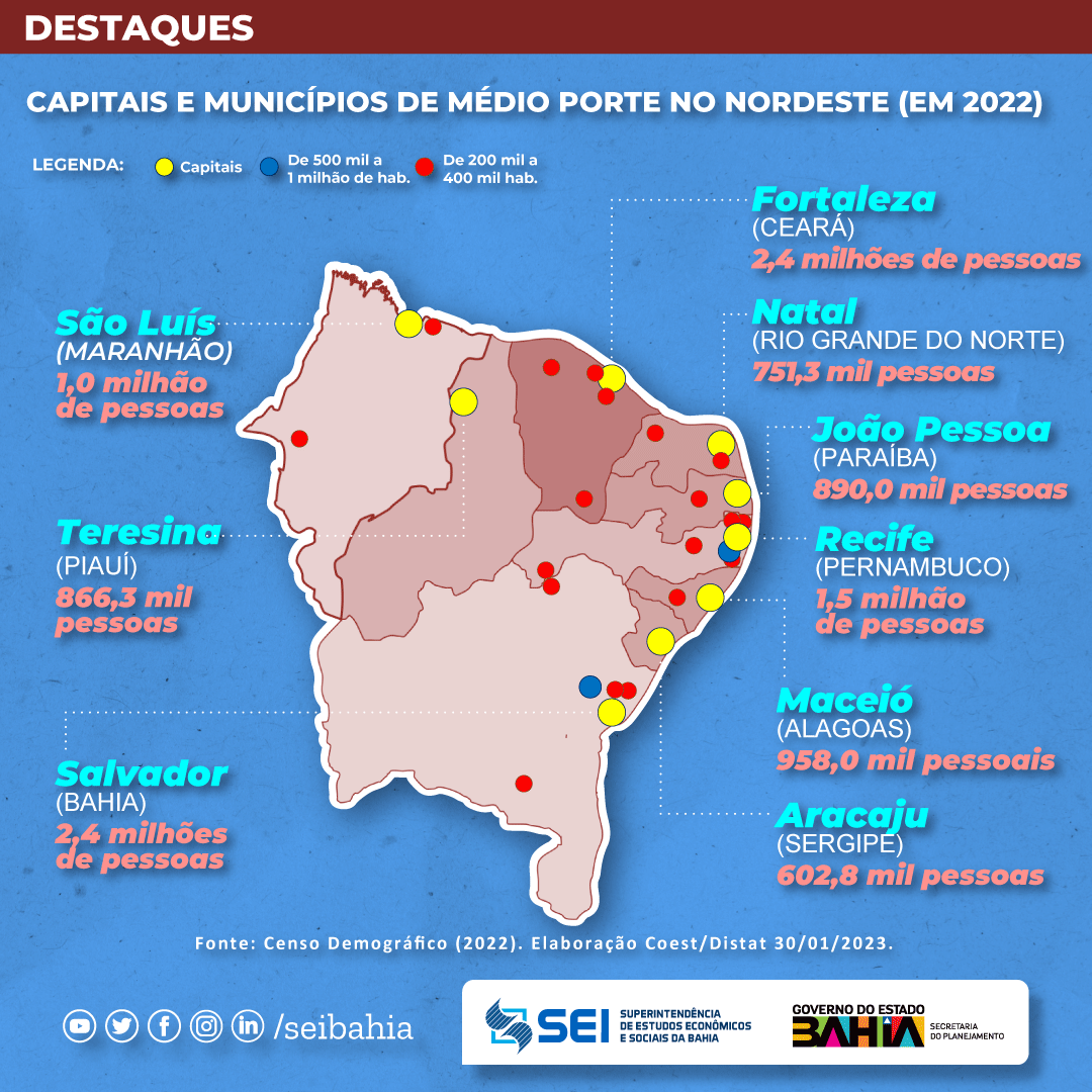 Entre os dados apresentados no Info Nordeste 2024 está a distribuição da população por capitais e municípios de grande porte (acima de 200 mil habitantes) nos nove estados nordestinos. Isso permite visualizar a concentração desses municípios em torno das capitais e sua distribuição pela faixa litorânea.