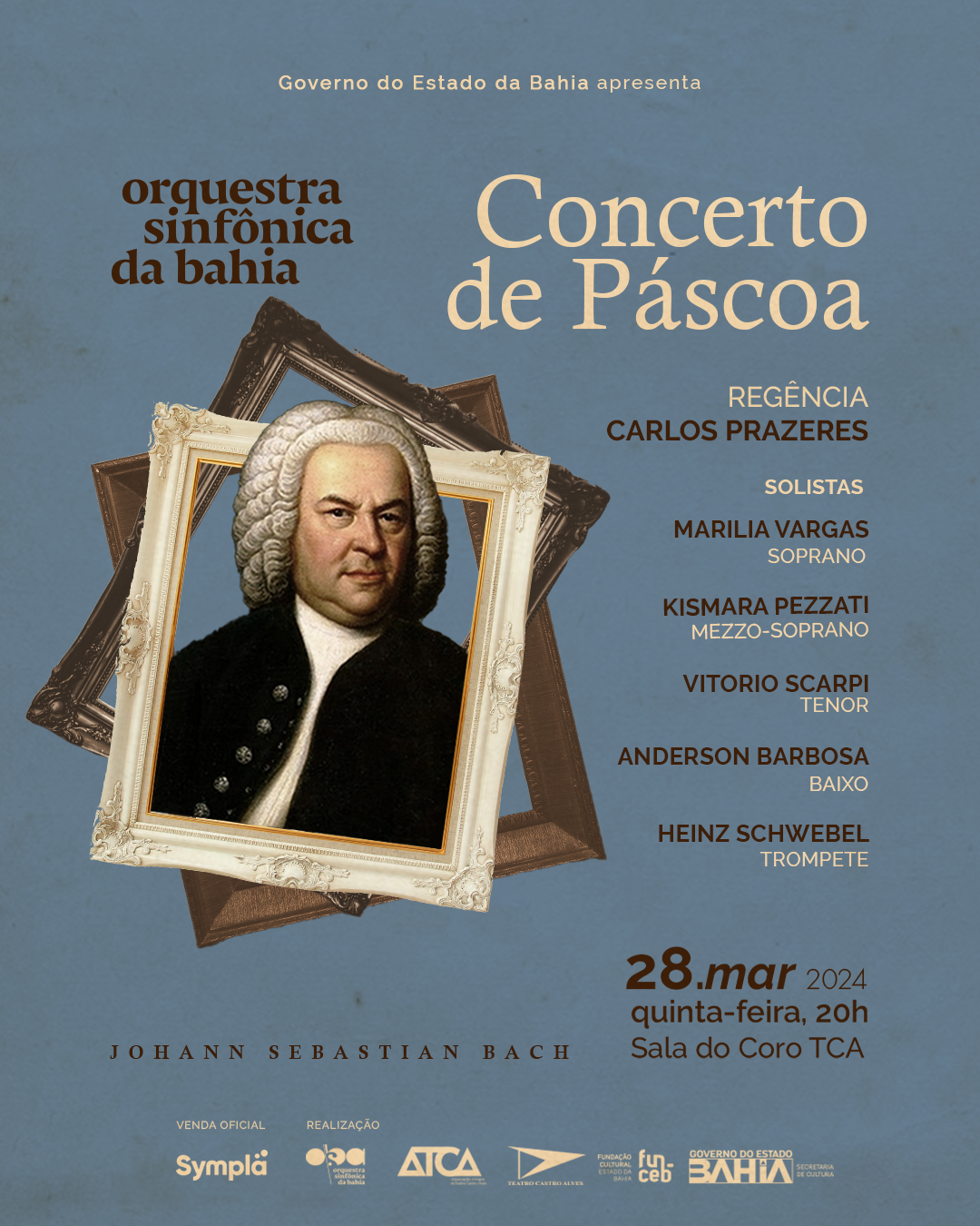 A Orquestra Sinfônica da Bahia faz o seu tradicional Concerto de Páscoa na quinta-feira (28), às 20h, na Sala do Coro do Teatro Castro Alves. Com a regência do maestro Carlos Prazeres, o programa da apresentação traz em destaque obras do compositor alemão da era barroca Johann Sebastian Bach (1685-1750). Os ingressos para a apresentação estarão à venda a partir das 14h, da próxima segunda-feira (25), pela plataforma online Sympla e pela bilheteria do TCA, nos valores de R$20 (inteira) e R$10 (meia).