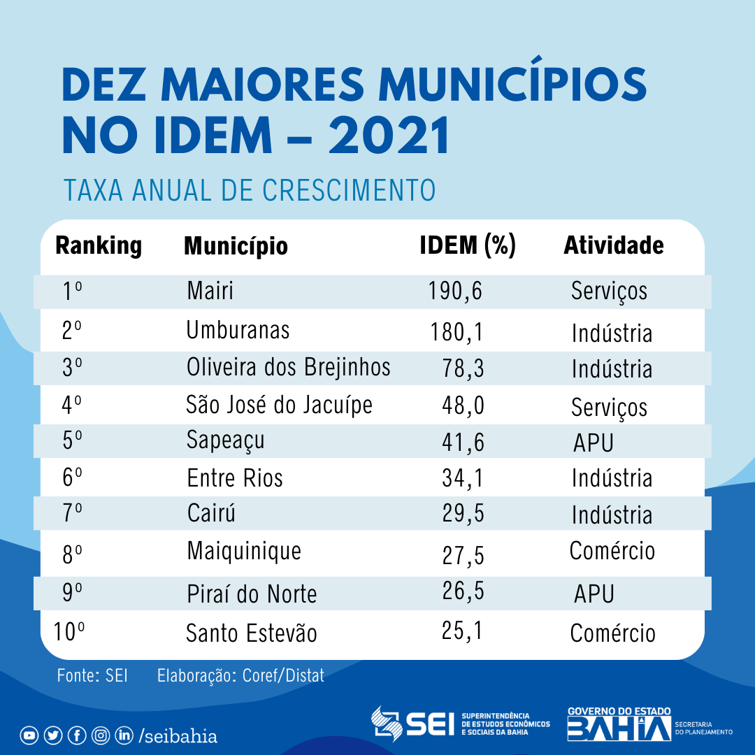 Os demais municípios que figuram no ranking dos 10 que mais cresceram no indicador em 2021 foram: Sapeaçu e Piraí do Norte – crescimento determinado pela expansão na atividade de Administração Pública; São José do Jacuípe – crescimento no setor de turismo; Entre Rios e Cairú – expansão na atividade industrial; por fim, Maiquinique e Santo Estevão – crescimento favorecido pela expansão nas atividades de comércio.